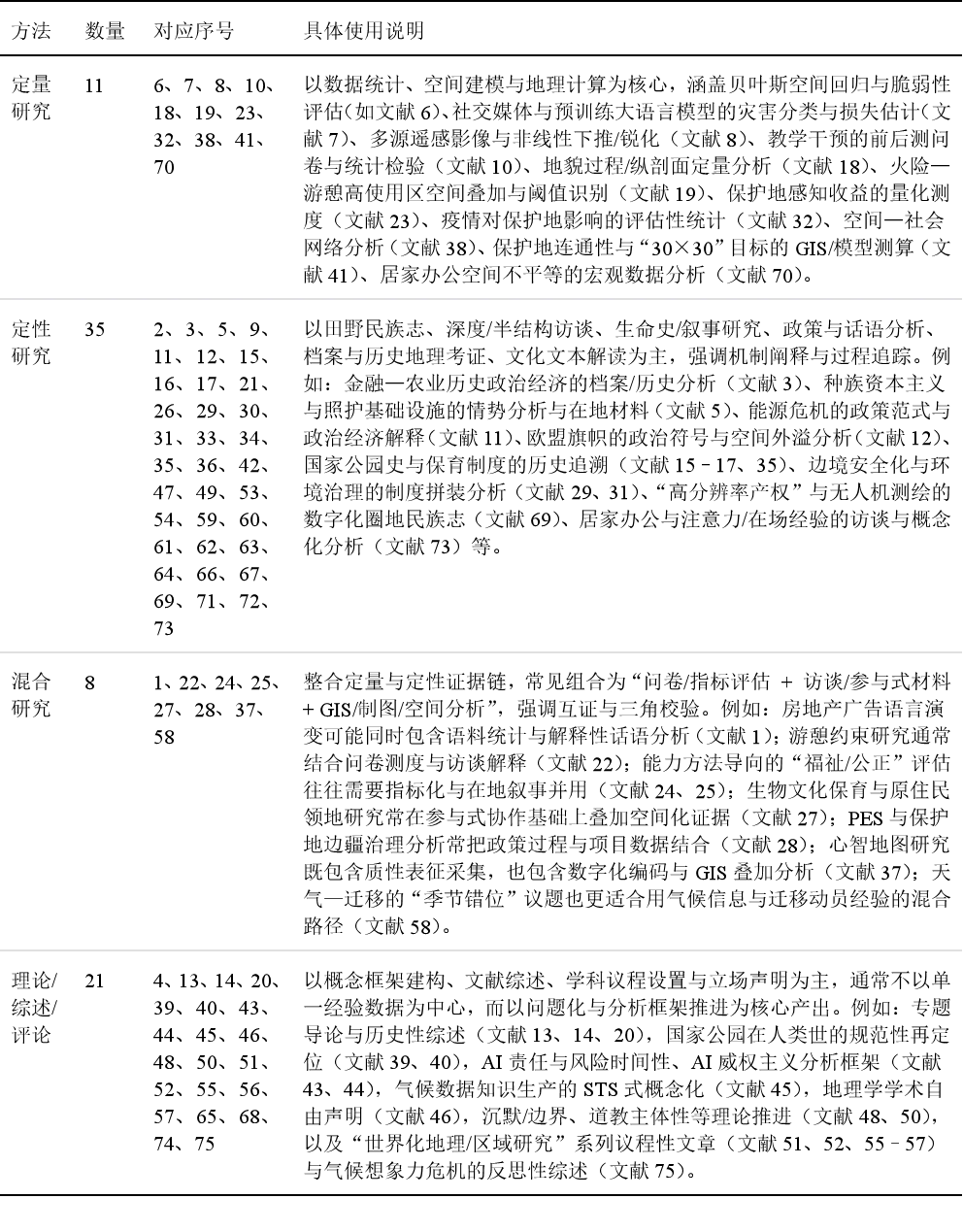 本月两刊合计75篇论文的方法谱系呈现“定性解释性研究与混合方法并重、地理计算与空间统计强化支撑、理论综述提供议程引领”的特征。总体上,研究更强调在具体场域中把“权力—治理—环境/风险—技术”联结起来,方法选择也随之走向跨数据源、跨尺度与跨技术的组合化。