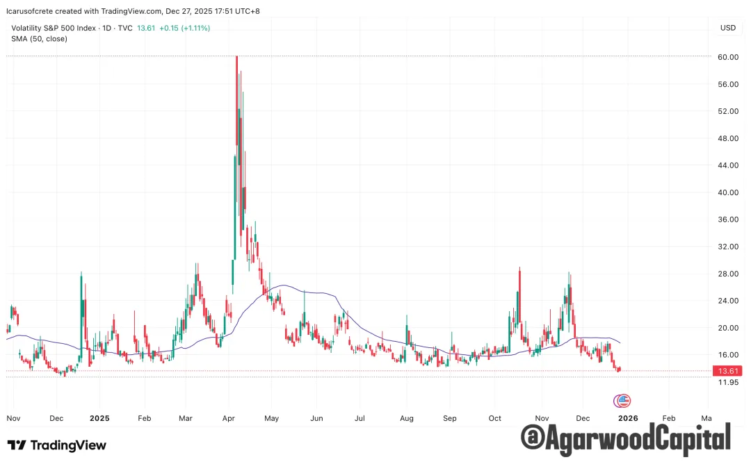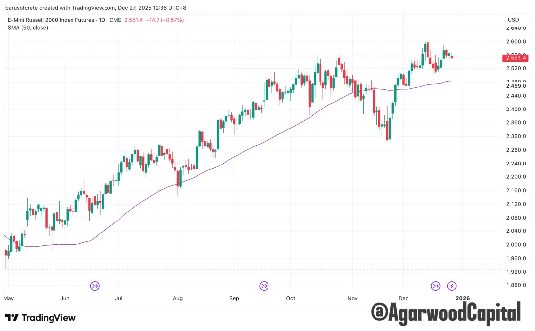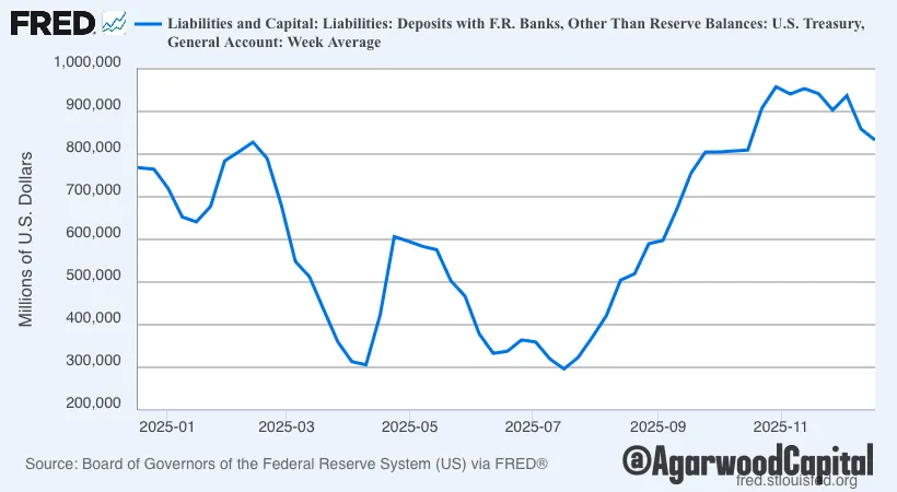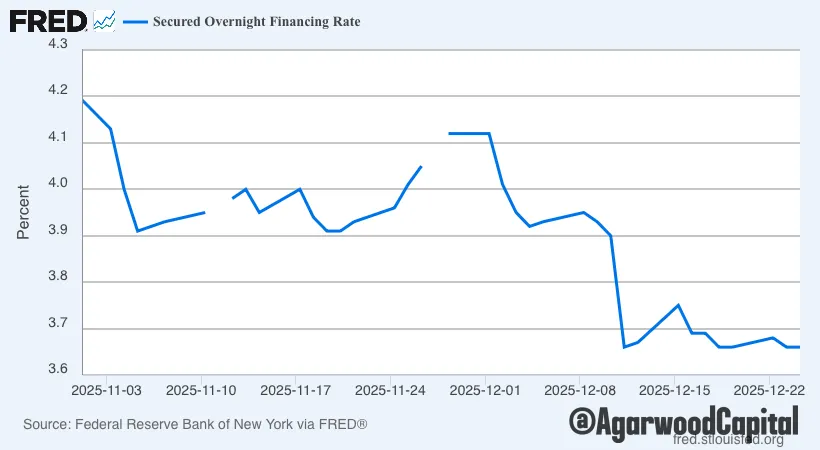 TGA 从高位回落約1200億美元,本週無更新(最新數據截至12月17日):改善了市場流動性和風險偏好,与“信用稳定、SOFR 下移”形成一致的底盘支撑。