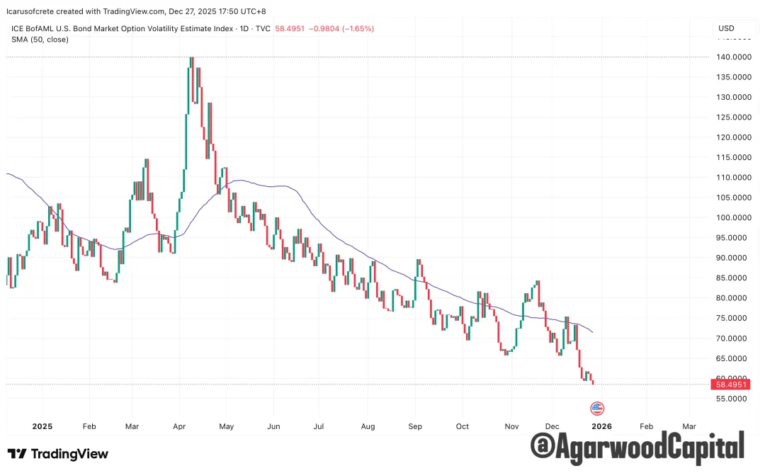 同樣美債波動率指標MOVE也是年內新低。