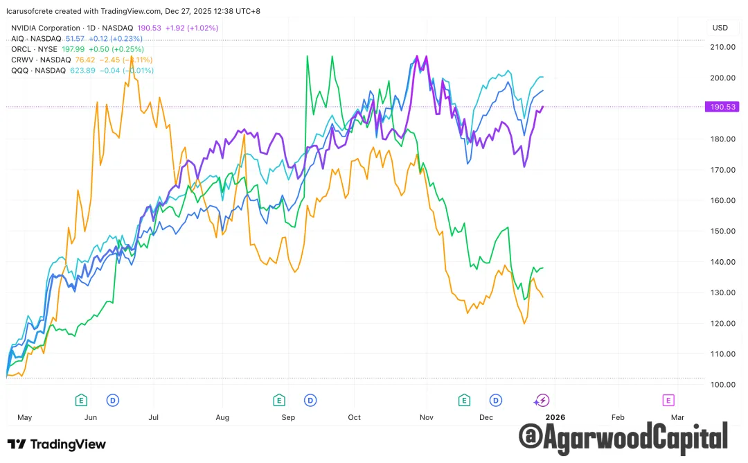 納指/AIQ/Nvidia/Oracle/Corewave 走勢對比圖