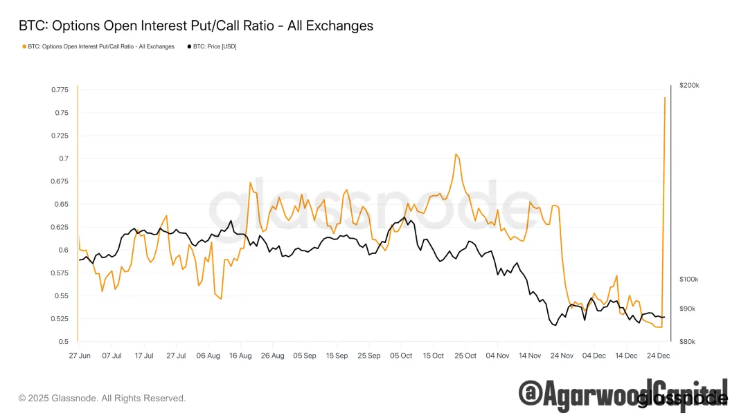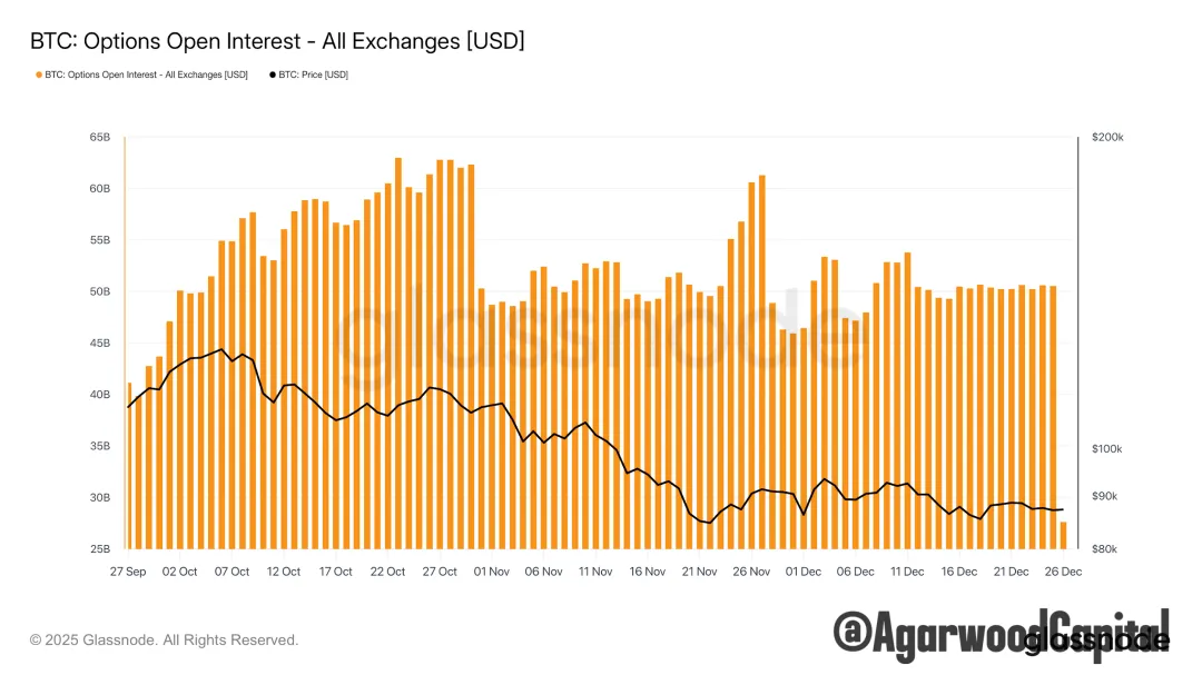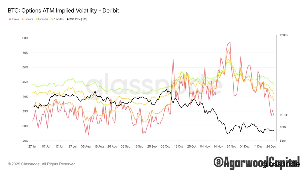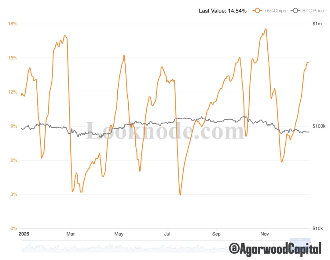 從URPD和籌碼集中度指標看,結合震盪區間縮量、假期交易清淡和波動性低位,以及年內最大期權在週五已到期,我們預計BTC很快將突破區間,極大概率就在下週。