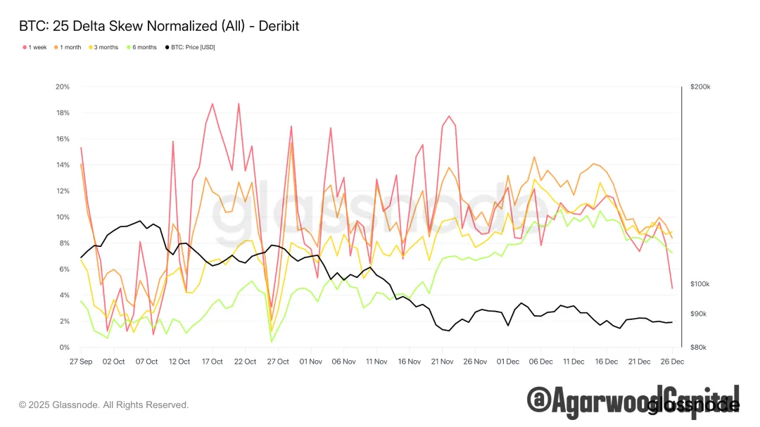 1周skew大幅走低,市場對下跌保護需求大幅降溫