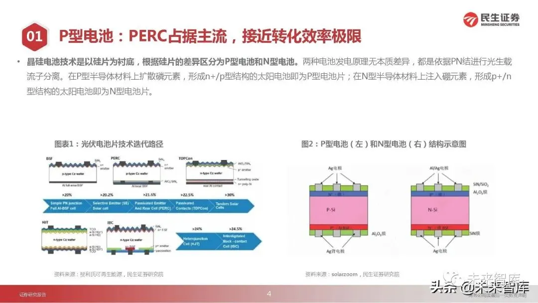 晶硅电池技术是以硅片为衬底,根据硅片的差异区分为P型电池和N型电池。两种电池发电原理无本质差异,都是依据PN结进行光生载 流子分离。在P型半导体材料上扩散磷元素,形成n+/p型结构的太阳电池即为P型电池片;在N型半导体材料上注入硼元素,形成p+/n 型结构的太阳电池即为N型电池片。