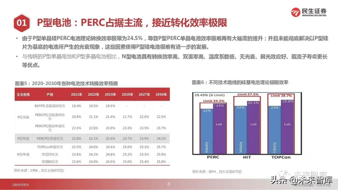 TunnelOxidePassivatedContact)技术,该技术可大幅度的提升N型电池的VOC和转换效率。根据理论计算,钝化接触太阳能电池 的潜在效率(28.7%)最接近晶体硅太阳能电池理论极限效率(29.43%),且远高于PERC的24.5%。目前TOPCon主流电池量产效率约23.7- 23.8%,部分电池厂商宣布已实现24.0%+;包括中来在内的许多公司已经将实验室效率做到了25%以上,未来前景广阔。