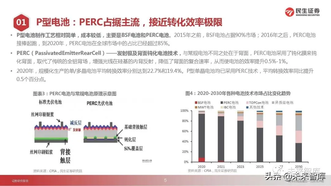 PERC(PassivatedEmitterRearCell)——发射极及背面钝化电池技术,与常规电池不同之处在于背面,PERC电池采用了钝化膜来钝 化背面,取代了传统的全铝背场,增强光线在硅基的内背反射,降低了背面的复合速率,从而使电池的效率提升0.5%-1%。2020年,规模化生产的单/多晶电池平均转换效率分别达到22.7%和19.4%。P型单晶电池均已采用PERC技术,平均转换效率同比提升 0.5个百分点。