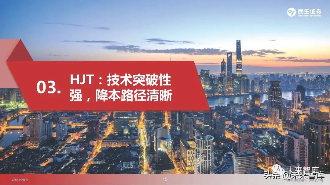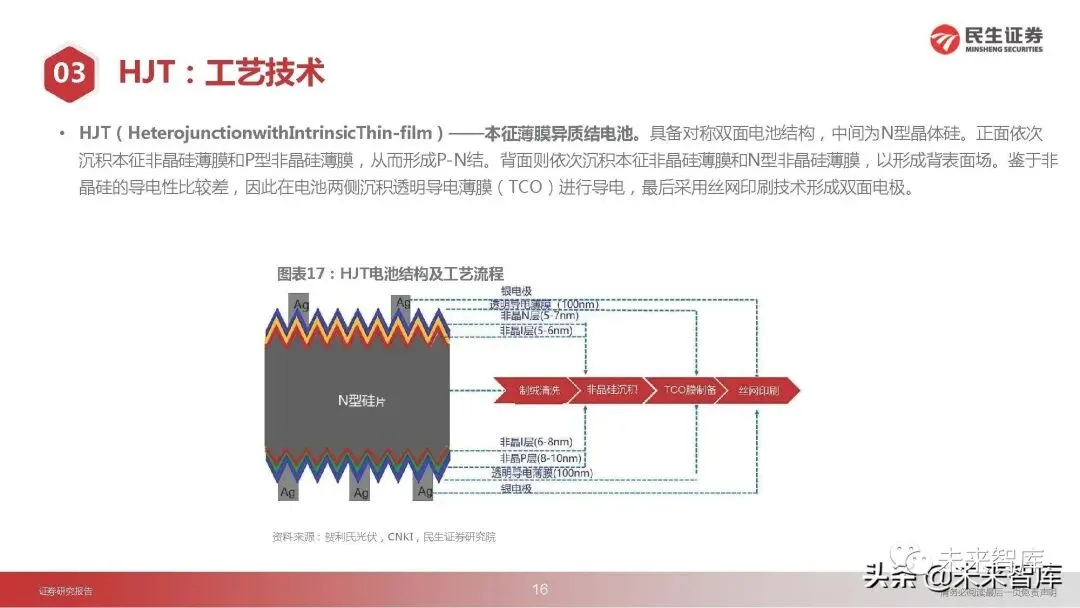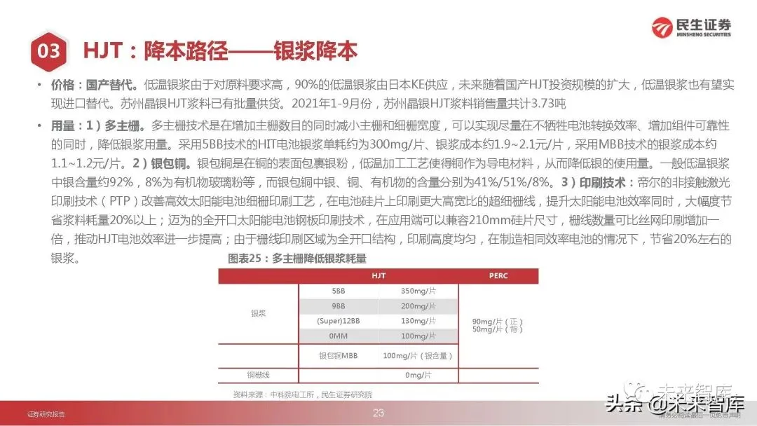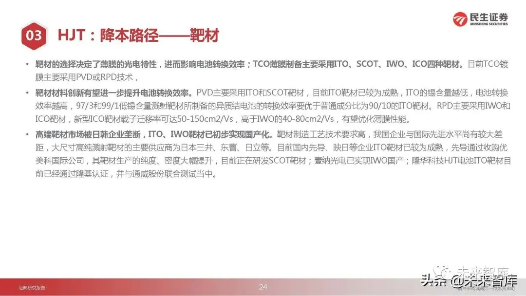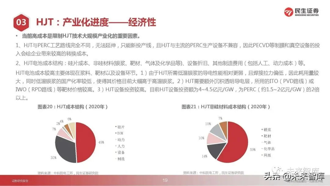 当前高成本是限制HJT技术大规模产业化的重要因素。 1、HJT与PERC工艺路线完全不同,无法延伸,只能新投产线,且HJT与主流的PERC生产设备不兼容,因此PECVD等制膜和真空设备的投 入会给企业带来较高的转换成本。2、HJT电池成本结构:硅片成本、非硅材料(银浆、靶材、气体及化学品等)、设备折旧、其他制造费用(包括人工、动力成本)等。HJT电池成本较高主要体现在浆料、靶材以及设备环节。1)由于HJT所需低温银浆的导电性能相对更弱,且焊接拉力偏低,因此耗用量较 大,同时低温银浆的国产化率较低,使得其价格目前大幅高于高温银浆。2)HJT需要额外沉积透明导电层,所用的ITO(PVD路线)或 IWO(RPD路线)等靶材价格较高。3)HJT设备投资较高。目前HJT设备投资额为4~4.5亿元/GW,为PERC(约1.5~2亿元/GW)的2倍 以上。