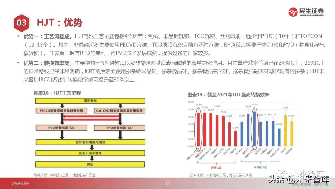优势一:工艺流程短。HJT电池工艺主要包括4个环节:制绒、非晶硅沉积、TCO沉积、丝网印刷;远少于PERC(10个)和TOPCON (12-13个)。其中,非晶硅沉积主要使用PECVD方法。TCO薄膜沉积目前有两种方法:RPD(反应等离子体沉积)和PVD(物理化学气 象沉积)。住友重工拥有RPD的专利,而PVD技术发展成熟,提供设备的厂家较多。