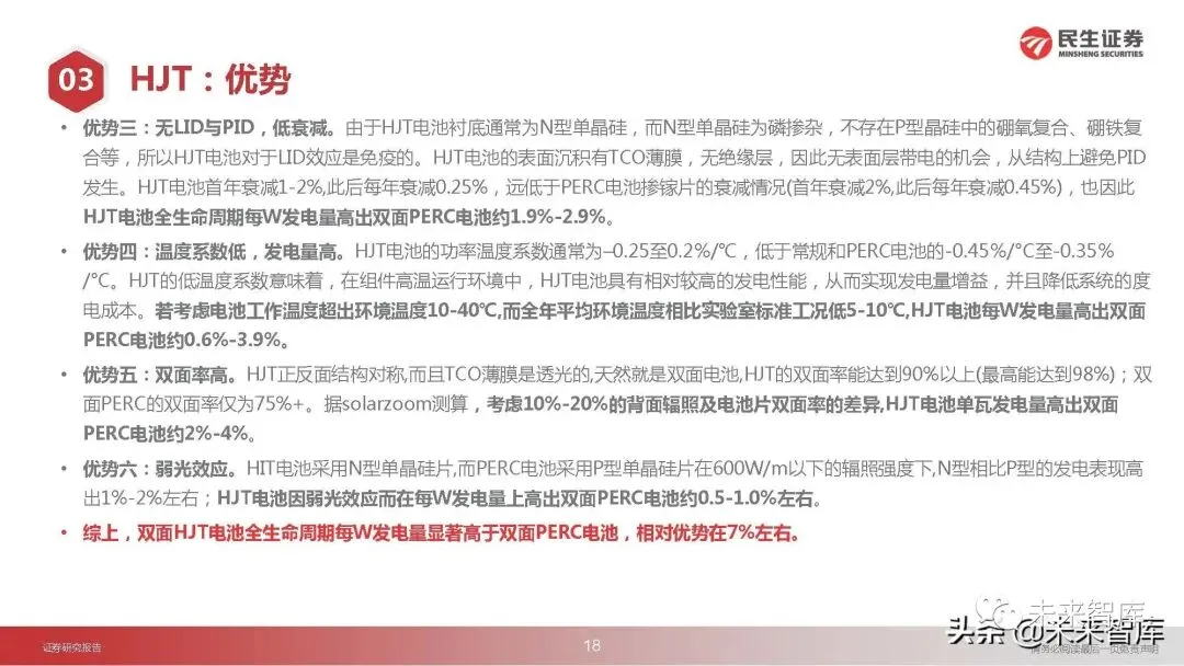 优势三:无LID与PID,低衰减。由于HJT电池衬底通常为N型单晶硅,而N型单晶硅为磷掺杂,不存在P型晶硅中的硼氧复合、硼铁复 合等,所以HJT电池对于LID效应是免疫的。HJT电池的表面沉积有TCO薄膜,无绝缘层,因此无表面层带电的机会,从结构上避免PID 发生。HJT电池首年衰减1-2%,此后每年衰减0.25%,远低于PERC电池掺镓片的衰减情况(首年衰减2%,此后每年衰减0.45%),也因此 HJT电池全生命周期每W发电量高出双面PERC电池约1.9%-2.9%。