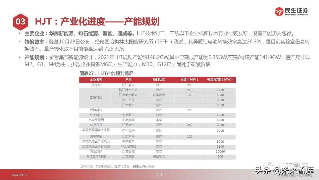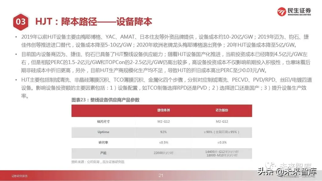 2019年以前HJT设备主要由梅耶博格、YAC、AMAT、日本住友等外资品牌提供,设备成本约10-20亿/GW;2019年迈为、钧石、捷 佳伟创等推进进口替代,设备成本降至5-10亿/GW;2020年欧洲老牌龙头梅耶博格退出竞争;20年HJT设备成本降至5亿/GW。目前国内设备商迈为、捷佳、钧石已具备了HJT整线设备供应能力;随着HJT设备国产化推进,当前投资成本已经降到4.5亿元/GW左 右,但是相较PERC的1.5-2亿元/GW和TOPCon的2-2.5亿元/GW仍高出较多,高设备投资成本不仅影响前期投入积极性,也意味着后 期非硅成本中折旧更高,另外,目前HJT生产商规模化生产均不足,导致HJT的折旧成本高出PERC至少0.03元/W。