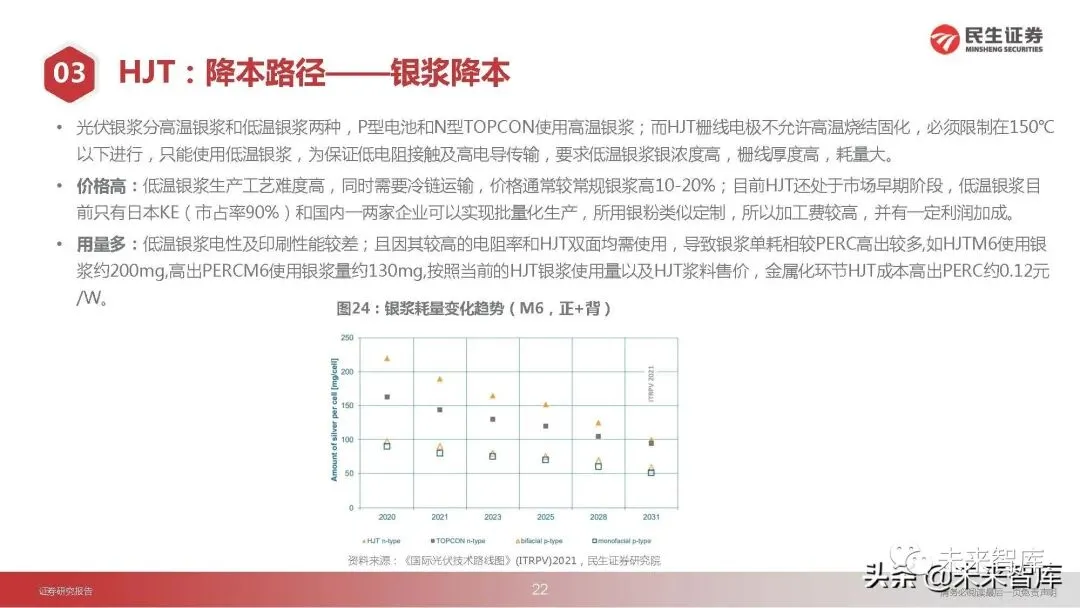 银浆:据PVInfolink统计,截至2021年底,TOPCon电池非硅成本已经有能力低于RMB0.3/W,对比PERC电池片目前平均RMB0.21- 0.23/W仍有差距,主要是银浆单耗较高,TOPCon正反面均使用银浆,M6TOPCon电池使用银浆约130mg较PERCM6电池高出约 60mg;但是现在背面可用银铝浆来降低成本。