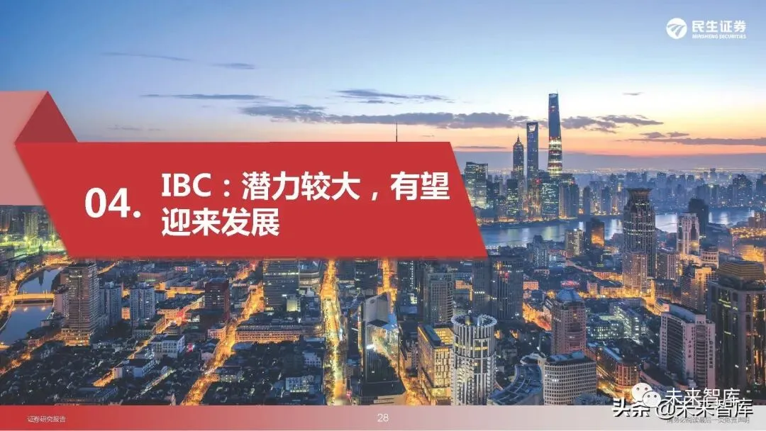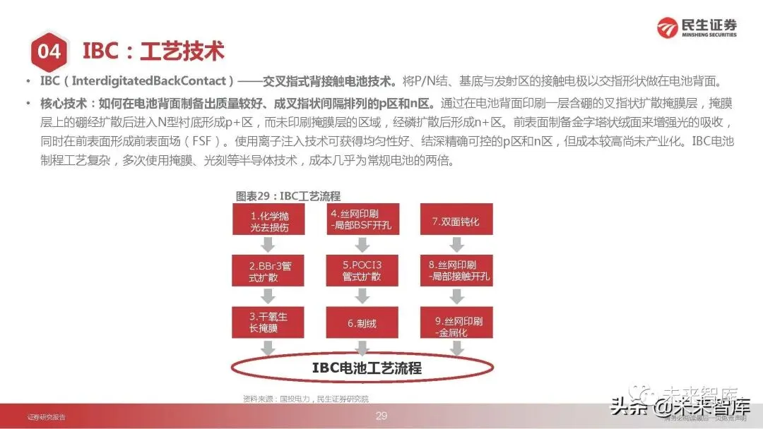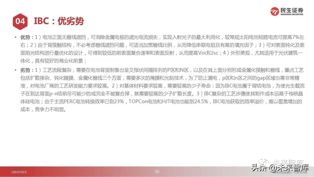 劣势:1)工艺流程复杂,需要在电池背面制备出呈叉指状间隔排列的P区和N区,以及在其上面分别形成金属化接触和栅线,重点工艺 包括扩散掺杂、钝化镀膜、金属化栅线三个方面,需要多次的掩膜和光刻技术,为了防止漏电,p区和n区之间的gap区域也需非常精 准,对电池厂商的工艺研发能力要求较高。2)对基体材料要求较高,需要较高的少子寿命:因为IBC电池属于背结电池,为使光生载流 子在到达背面p-n结前尽可能少的或完全不被复合掉,就需要较高的少子扩散长度。3)IBC复杂的工艺步骤使其制作成本远高于传统晶 体硅电池;由于主流PERC电池转换效率已到23%,TOPCon电池和HJT电池也能到24.5%,IBC电池获取的效率溢价,难以覆盖增加的 成本,竞争力不明显。