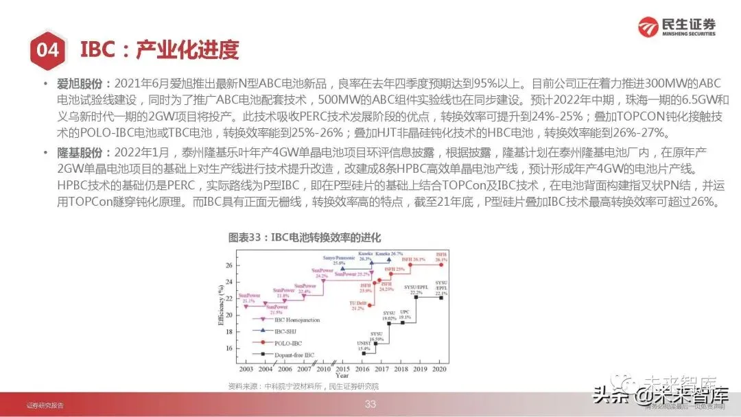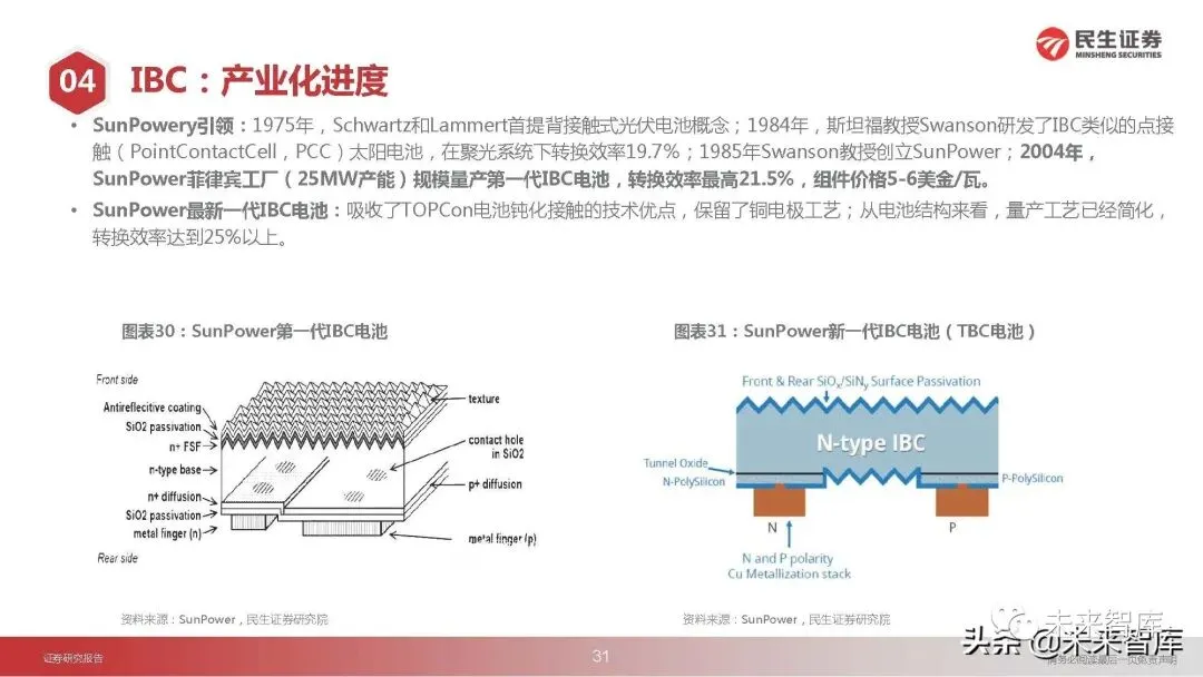 unPowery引领:1975年,Schwartz和Lammert首提背接触式光伏电池概念;1984年,斯坦福教授Swanson研发了IBC类似的点接 触(PointContactCell,PCC)太阳电池,在聚光系统下转换效率19.7%;1985年Swanson教授创立SunPower;2004年, SunPower菲律宾工厂(25MW产能)规模量产第一代IBC电池,转换效率最高21.5%,组件价格5-6美金/瓦。