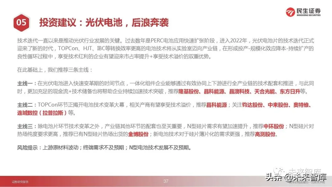 技术迭代一直以来是推动光伏行业发展的关键。过去数年是PERC电池应用快速扩张阶段,进入2022年,光伏电池片的技术迭代正式 迎来了新的时代,TOPCon、HJT、IBC等转换效率更高的电池技术将从实验室迈向产业链,在形成投产-规模化效应降本-持续扩产的 良性循环过程中,享受技术红利的企业有望迎来市占率提升+享受技术溢价的双重优势。