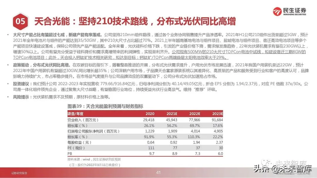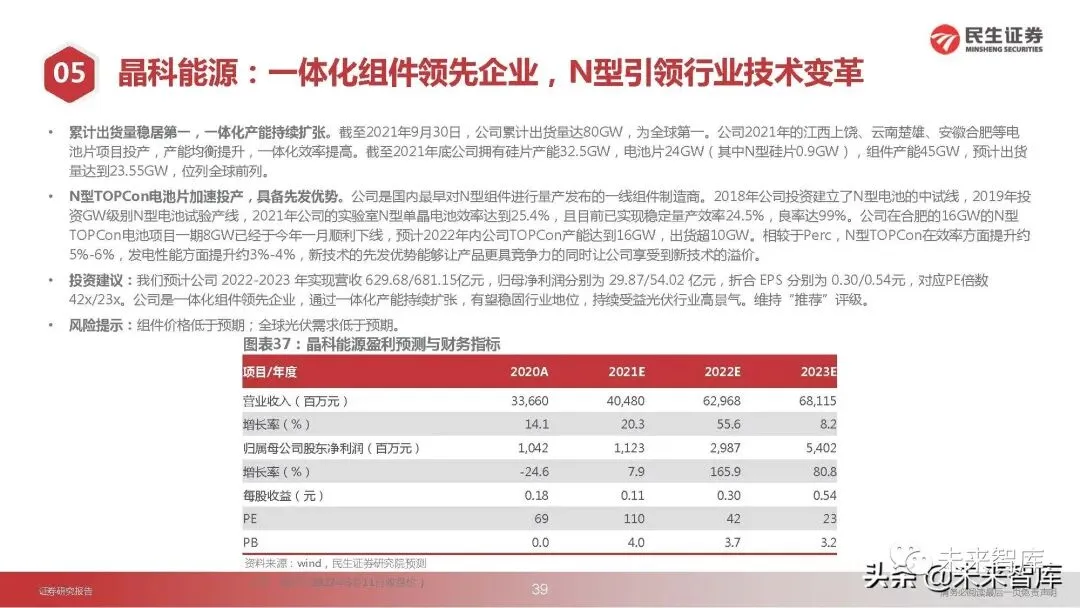 加速产能扩张,稳固行业龙头地位。2021Q1-Q3公司组件出货27GW左右,其中外销25-26GW。单三季度组件出货10GW左右,环比基本持平,其中外销规模 9.0GW左右。公司自2020年首次成为组件出货龙头后,目前龙头位置稳固,随着组件行业集中度持续提升,预计2022年公司组件产能将超80GW,出货将超 60GW,持续强化龙头地位;与此同时,公司硅片和电池片产能仍在扩张,一体化战略持续推进。(报告来源:未来智库)