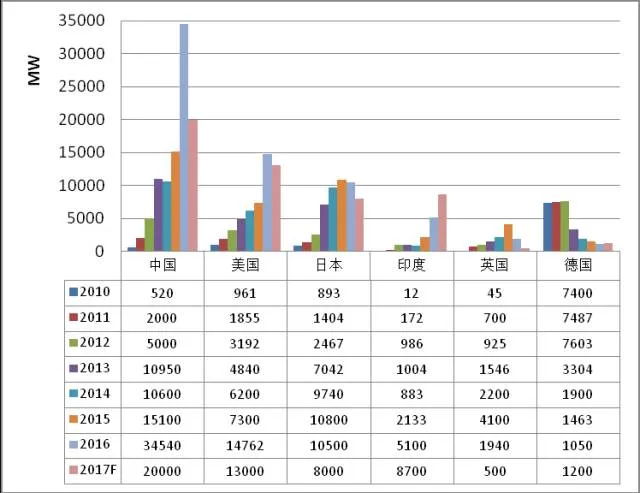2016年是全球光伏装机增长的一个里程碑。据德国太阳能协会最新发布的统计数据显示,2016年全球光伏新增装机70GW,比2015年增长大约30%,至此,全球光伏装机总量达到300GW。在2016年的新增装机量中,中国贡献了34.54GW,与2015年新增装机量相比,同比增长了128%,累计装机容量77.42GW,新增和累计装机容量均为全球第一。美国2016全年光伏装机14.76GW,装机量同比增长97%,其中公共事业装机量起到了主要的拉动作用。