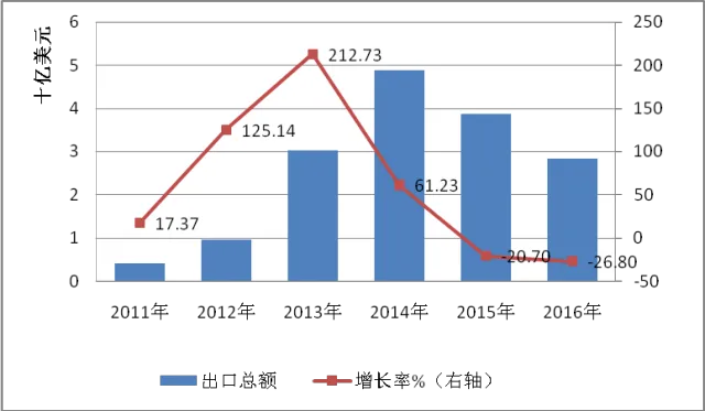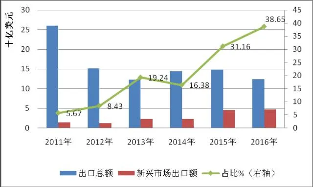 2016年,美国市场占中国组件出口的市场份额下降到11%,出口金额下降20.33%,为14.27亿美元。