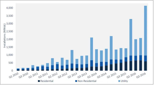根据GTM和SEIA联合发布的数据显示,2016年美国新增光伏装机达到14.76GW,同比增长了97%,堪称“光伏大跃进”。这一年,美国规模化的光伏装机自2011年以来首次超过了居民屋顶光伏装机(2.583GW)。