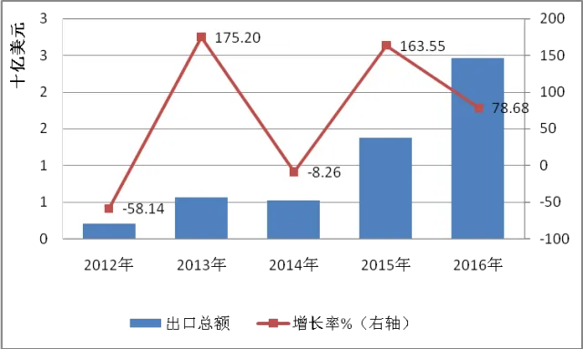 印度在2016年一跃成为我国光伏组件出口的第二大市场,2016年,我国对印度光伏组件出口金额24.59亿美元,较2015年同比增长78.68%。