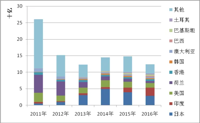 日本仍为我国光伏组件出口的第一大市场,但2016年,我国对日光伏组件出口金额28.34亿美元,较2015年同比下滑26.80%。