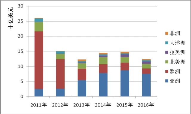 从洲别市场来看,2016年我国光伏组件对所有洲别市场出口额均表现为同比下滑。与2015年相比,包括对亚洲出口在内,所有洲别市场出口形势均有不同程度恶化——其中,对欧洲、北美洲、非洲出口额降幅超过20%,对欧洲出口额降幅则接近30%,该地区也成为2016年出口表现最差的洲别市场。