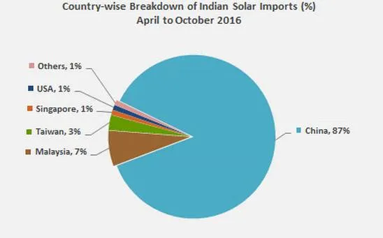 在我国光伏组件对印出口大幅上升的同时,印度光伏行业对中国产品的依赖度也在上升,据印度商务部统计,在2016年4-10月期间,在印度光伏产品进口来源国中,中国产品已经占据了87%的市场,其次为马来西亚,但占比仅7%,排在第三位的中国台湾,占比也仅有3%。