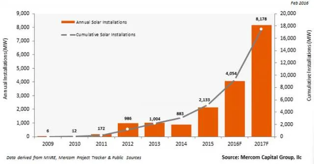 据印度新能源与再生能源部(NMRE)统计的数据显示,截至2016年12月31日,全国太阳能装机量达9,012MW,正式突破9GW大关;装机量超过500MW的地区分别是:坦米尔纳杜邦(1,591MW)、拉贾斯坦邦(1,318MW)、古吉拉特邦(1,159MW)、安德拉邦(980MW)、特伦甘纳邦(973MW)、中央邦(840MW)、旁遮普省(545MW)。