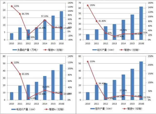 图表 10 2010-2016年我国多晶硅、硅片、电池片以及组件产量情况