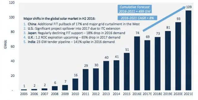 2016年全球光伏新增装机70GW,比2015年增长大约30%,然而,进入2017年后,作为我国光伏出口的几大重点市场--日本、德国、美国都将面临政策上的转变和监管上的不确定性,整体市场需求面临缩减,也将进一步影响我国光伏出口的表现。