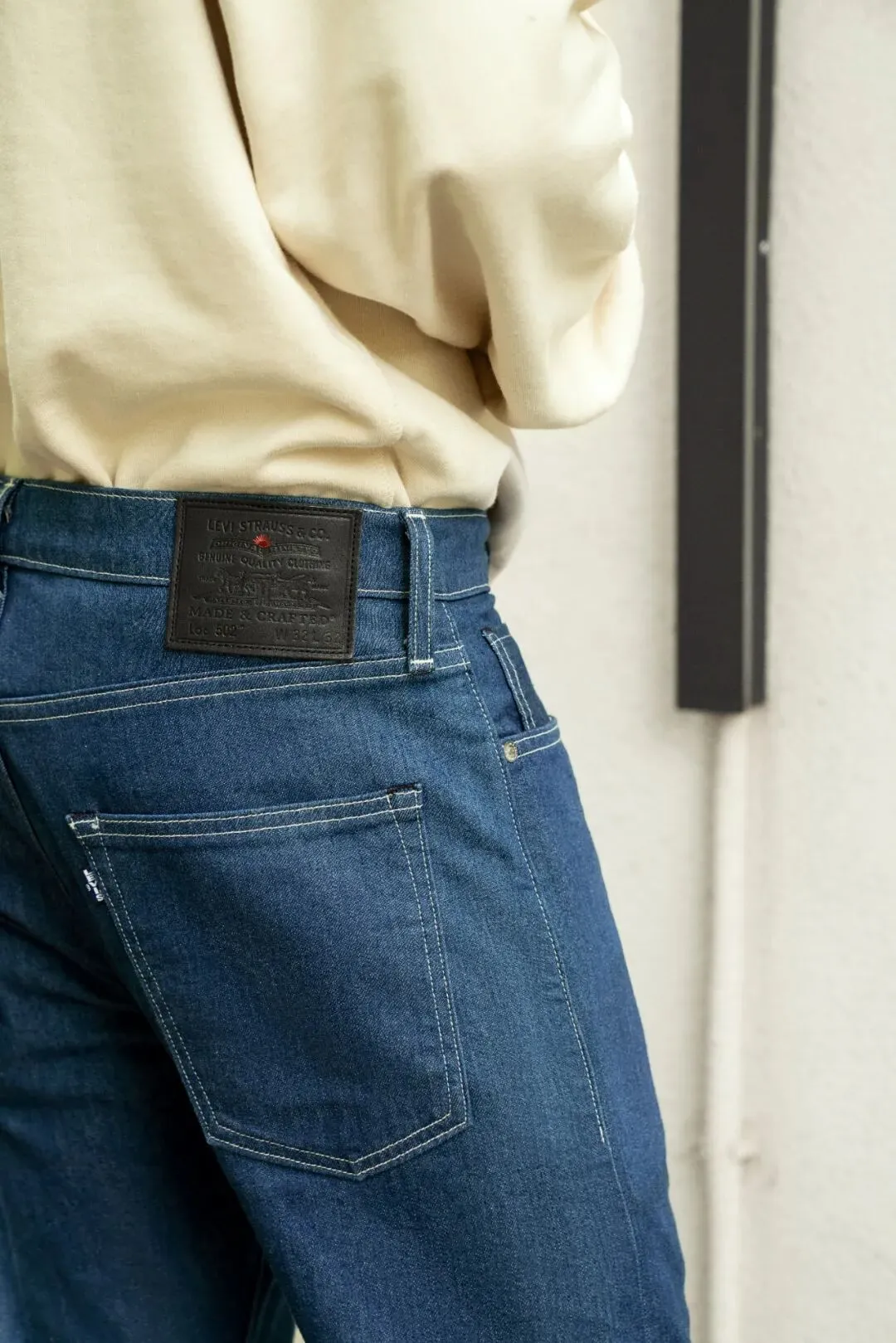 丹宁作为一种美式文化,传入日本后在手工艺上也如日式手冲般,更加「青出于蓝」。ZICAI 身上这条 LEVI’S® 日本制,时至今日也在与日本业内专注的传统工艺布商及工匠合作,为经典型号注入细腻质感。比如日本传奇丹宁布料制造商 KAIHARA 便用独特的内部绳索染色技术赋予该系列引以为傲的蓝耳布边。