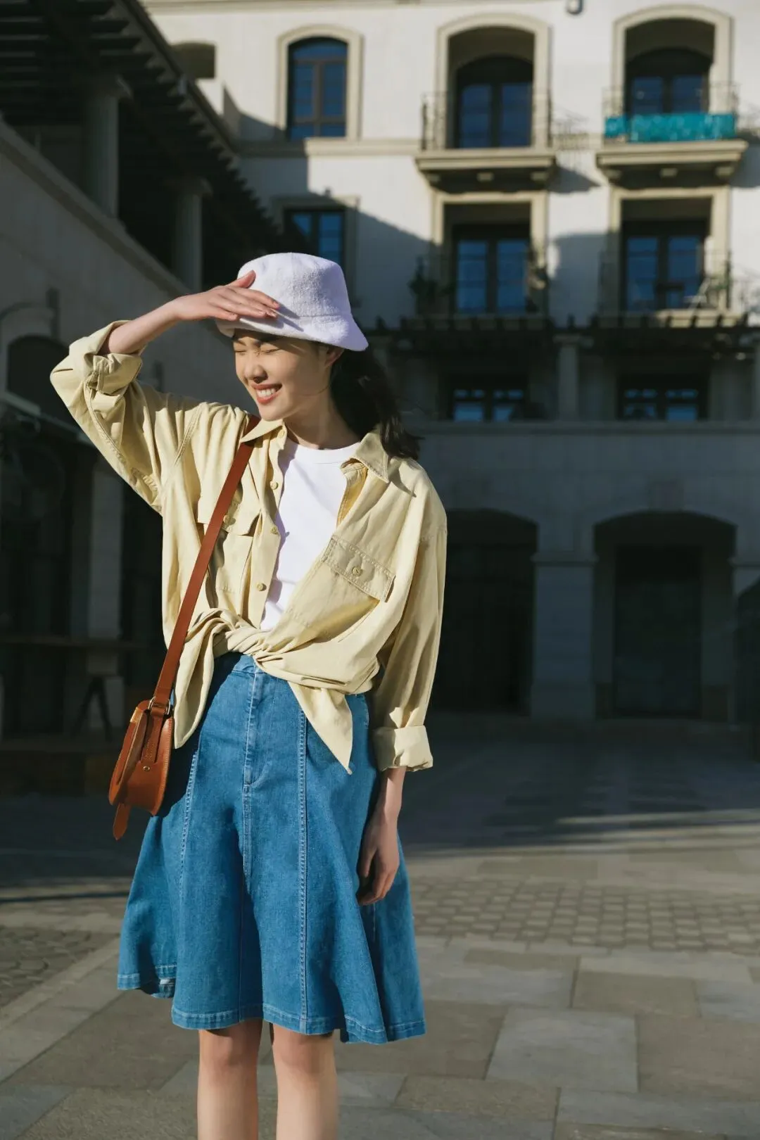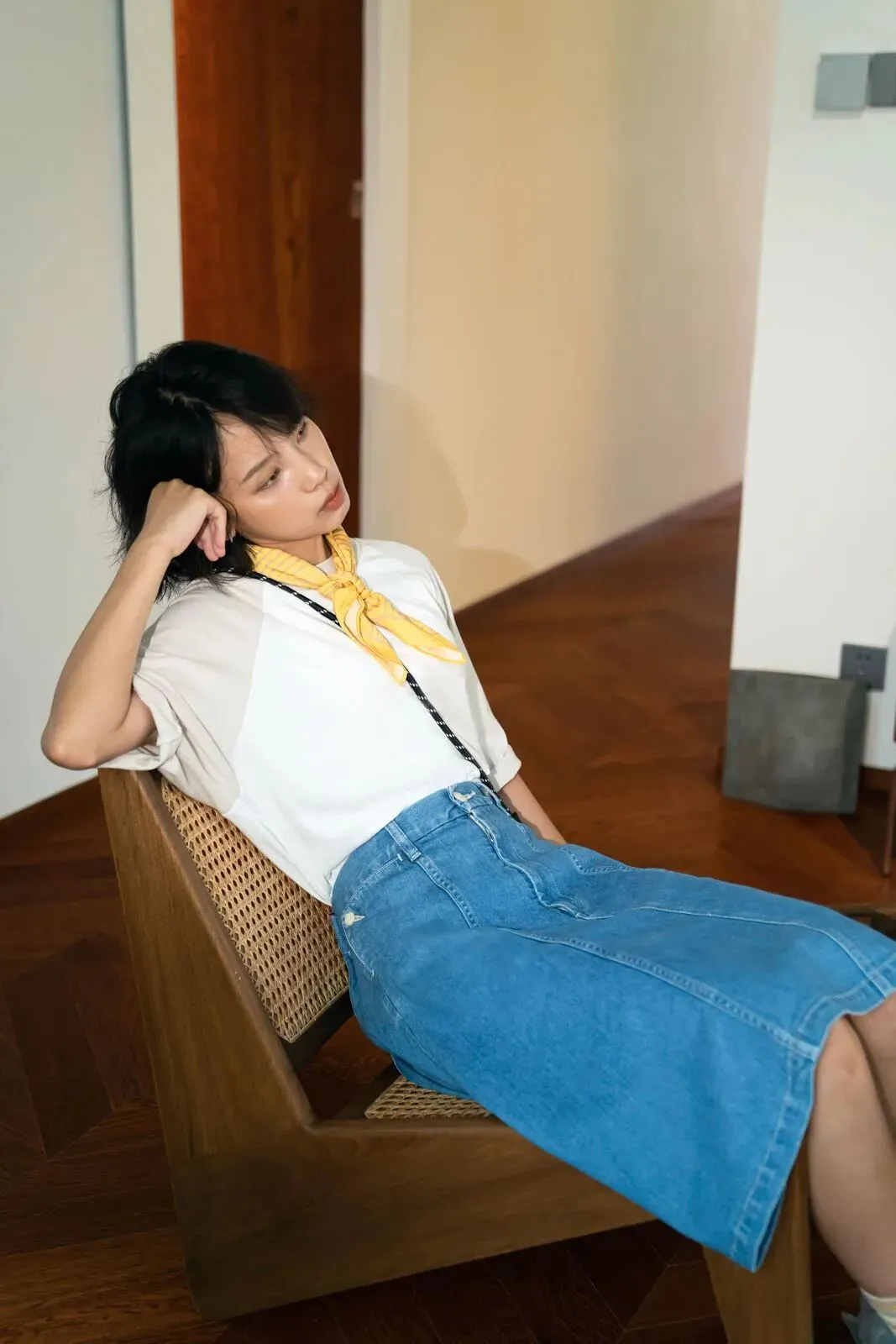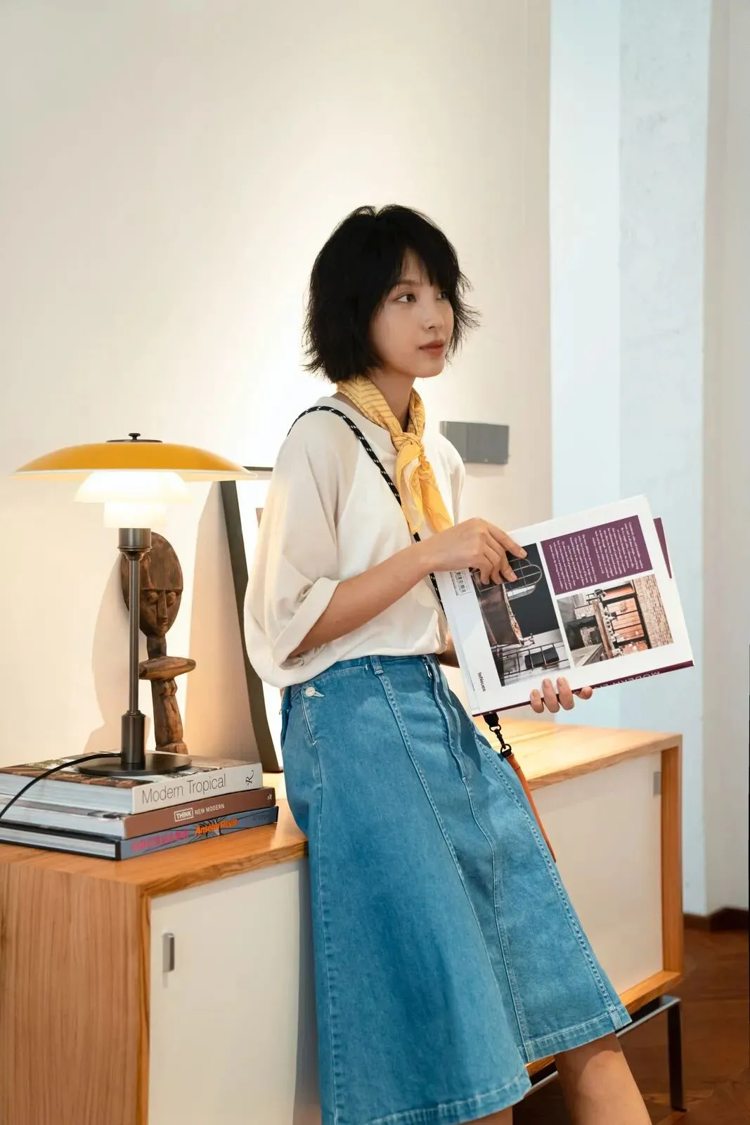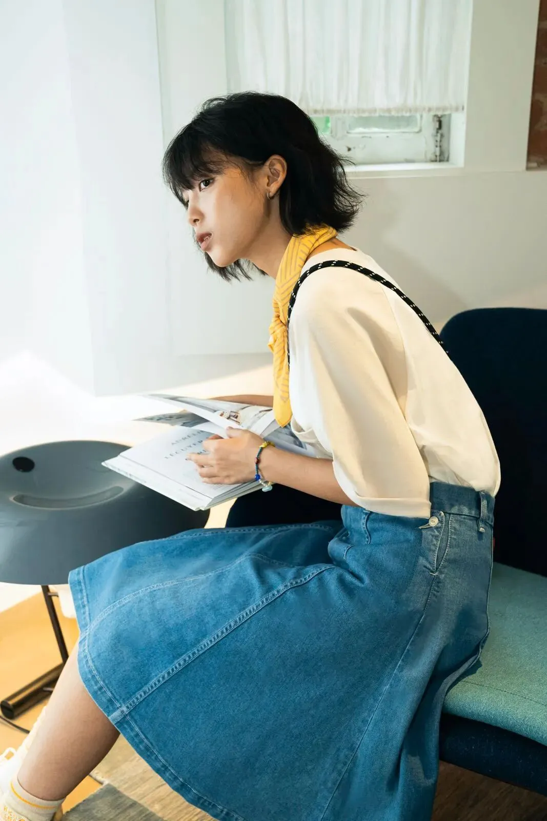 下午 3-4 点的阳光,最适合拍照。片场多年积累下美照经验,弯弯在家具店里熟练地找到最佳拍摄角度。LEVI’S® 日本制牛仔过膝裙在她身上,颜色素净但不乏精细的表现力,丝巾和小单肩包配饰更显示出少女的「质感小心思」, 这也是该系列,首次推出的裙装版型。