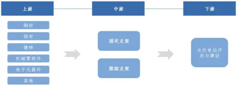 光伏支架行业的上游主要是大宗金属材料供应商,包括钢材、铝材、非金属材料、镀锌材料等,上游市场基本处于充分竞争状态,故以钢材和铝材为代表的大宗金属材料的价格,对光伏支架原材料成本影响较大;中游主要是光伏支架生产厂商,包括对光伏支架的研发设计和生产制造;下游主要是光伏电站的投资及运营企业。