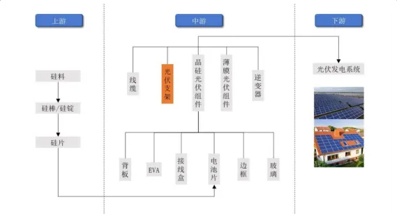 光伏行业产业链上游主要是硅料、硅片等原材料;中游主要是电池片、组件、逆变器、汇流箱、光伏支架、线缆、辅材等光伏系统零部件;下游主要是太阳能光伏电站建设、运营及维护等光伏电站应用。