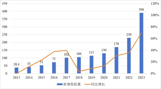 2013-2023年全球新增光伏装机量统计图(单位:GW)