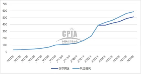 2011-2023年全球光伏年度新增装机规模以及2024-2030年新增规模预测
