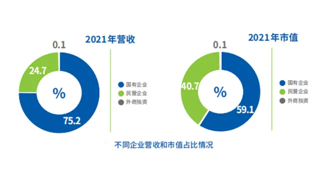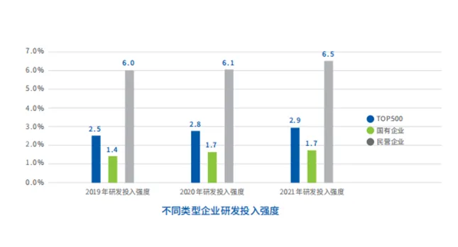 “国大民新”特征显著。数字经济企业TOP500中,国有、民营企业分别占比46.6%、52.8%,各占半壁江山。国有企业主要分布在电信业、通信设备制造业等传统领域,在营收、市值、利润等方面更“大”,约占数字经济企业TOP500总营收的75.2%、总市值的59.1%,利润总额增速高于民企14个百分点。民营企业主要分布在移动互联网、人工智能、平台经济等前沿领域,在创新研发方面投入更“高”,其平均研发投入强度高达6.5%,是国有企业的3.7倍,占据了研发投入强度排名前10中的9席。