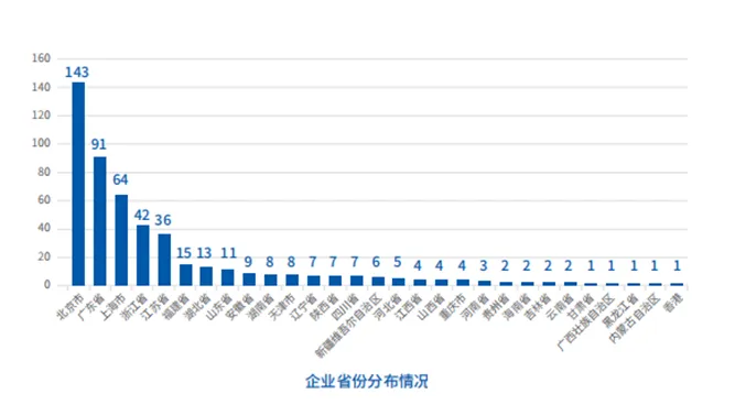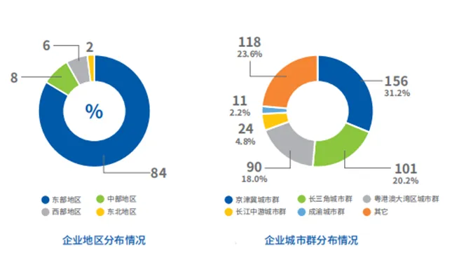 数字经济企业TOP500区域分布呈“东部领跑、中西部崛起、东北跟进”格局。超八成TOP500企业分布在东部地区,北京以143家独居第一梯队,广东、上海、浙江、江苏位于第二梯队,广东省以91家位居第二梯队榜首。中、西部地区借政策东风快速跟进,不断强化招商力度,积极寻找优势领域推动数字经济变道超车,在智能终端、智能传感器、新型显示等领域引进了一批数字经济企业落户,湖北、山东、安徽、湖南、陕西、四川等省市TOP500企业数量靠前。东北地区也有一批企业进入TOP500行列。