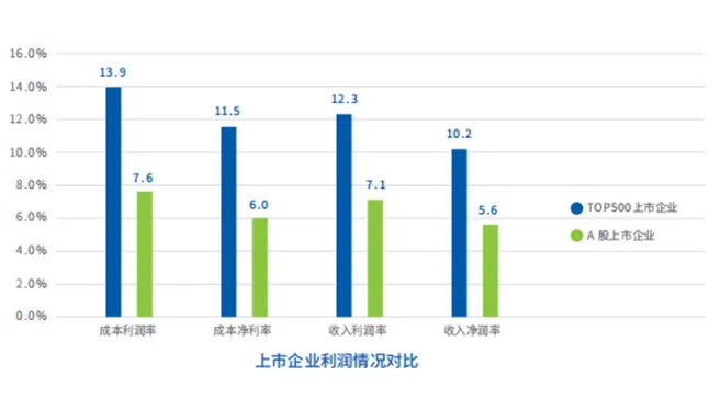 上市企业“量质双优”亮点突出。数字经济企业TOP500中,共有427家上市企业,占比85.4%,涵盖半导体集成电路、互联网、软件、消费电子、电信、大数据、人工智能、汽车、金融等多个细分行业。上市企业平均成本利润率和平均成本净利润率分别为13.9%、11.5%,均高于A股主板上市公司平均值6个百分点;平均收入利润率和平均收入净利润率分别为12.3%、10.2%,均高于A股主板上市公司平均值5个百分点。