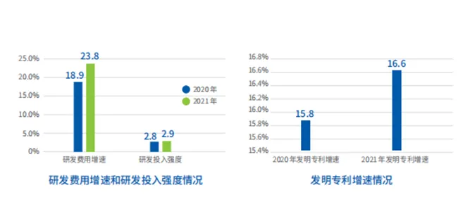 数字经济企业TOP500是数字技术创新突破的引领者。研发费用方面,TOP500企业平均研发费用增速为23.8%,超过全国研发费用增速约9.6个百分点。研发投入强度方面,TOP500企业平均投入强度为2.9%,高于全国研发投入强度约0.5个百分点。知识产权方面,TOP500企业共拥有约81万件发明专利,约占我国发明专利有效量22.5%。