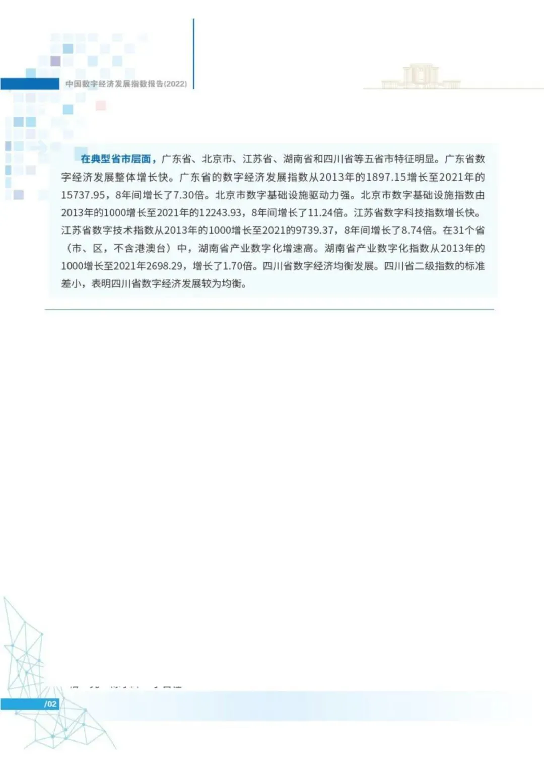 从典型省市看,广东省、北京市、江苏省、湖南省和四川省等五省市特征明显。从2013年到2021年,广东省整体增速快,基于五个二级指数综合计算的广东省数字经济发展指数的增速位居全国前列。北京市数字基础设施驱动力强,增长速度位于全国前列。江苏省和湖南省各有特色,江苏省数字科技指数增长快,而湖南省产业数字化增速高。四川省二级指数的标准差较小,表明四川省数字经济发展较为均衡。