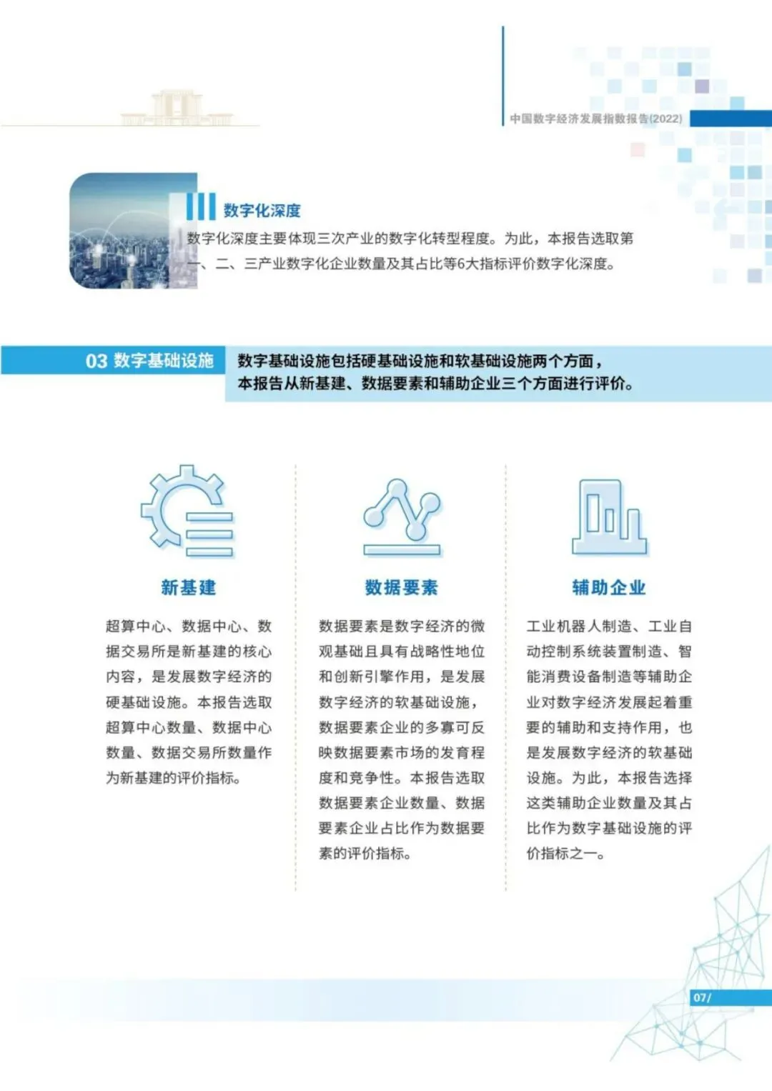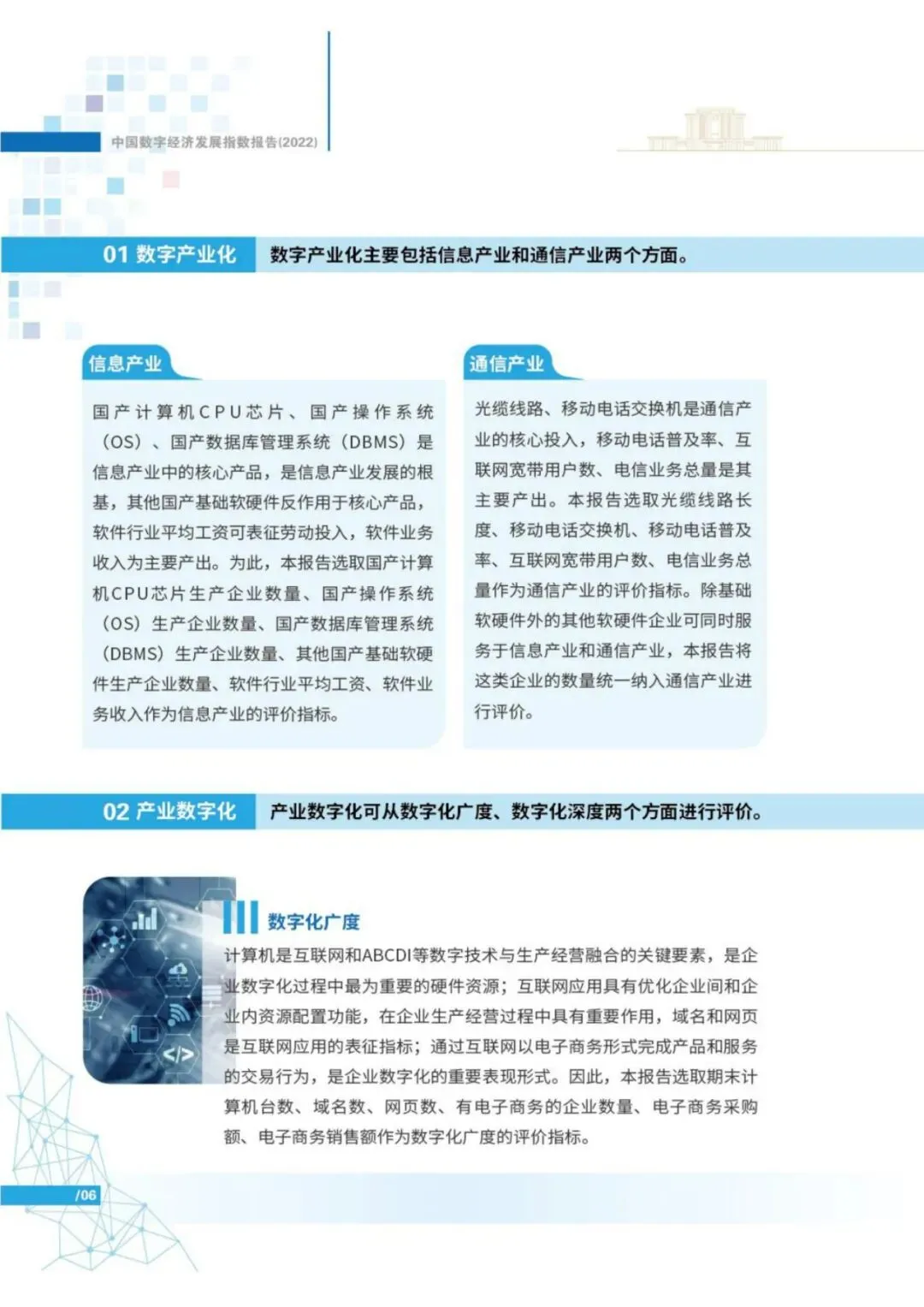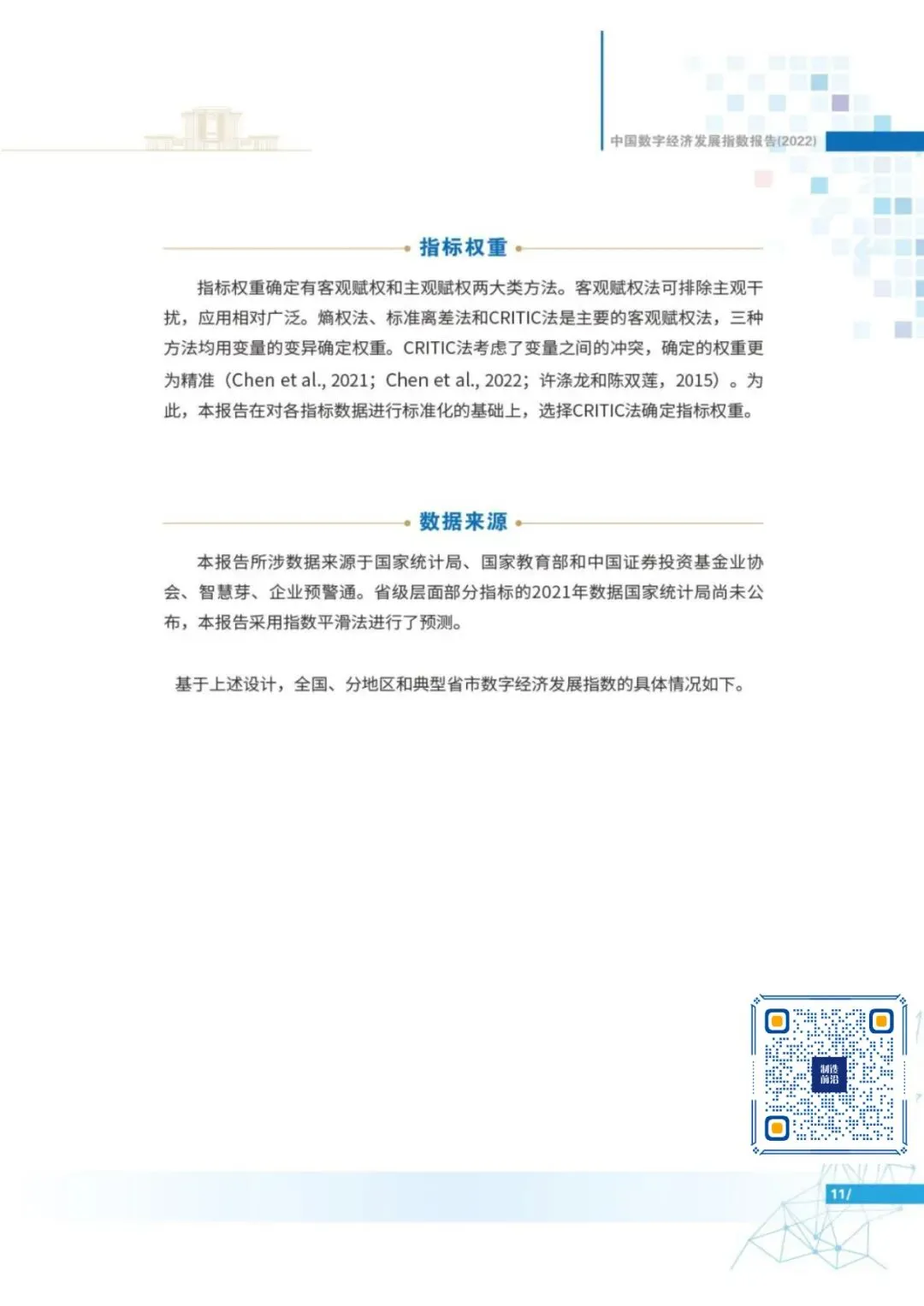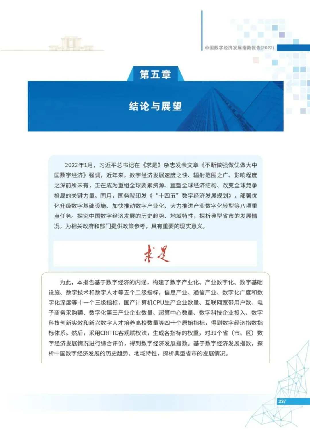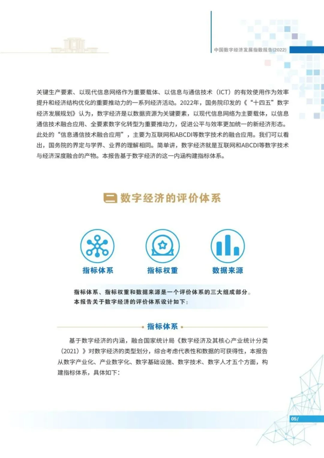 目前,中国数字经济规模已经连续多年位居世界第二。特别是新冠肺炎疫情暴发以来,数字经济在支持抗击新冠肺炎疫情、恢复生产生活方面发挥了重要作用。为探究中国数字经济发展的历史趋势、地域特性,探析典型省市的发展情况,工业和信息化部电子第五研究所、零壹智库通过构建数字经济指标体系,采用CRITIC客观赋权法确定指标权重,对全国、东中西部地区、31个省(市、自治区,不含港澳台)的数字经济发展情况进行了综合评价,并形成了《中国数字经济发展指数报告(2022)》(简称“报告”)。
