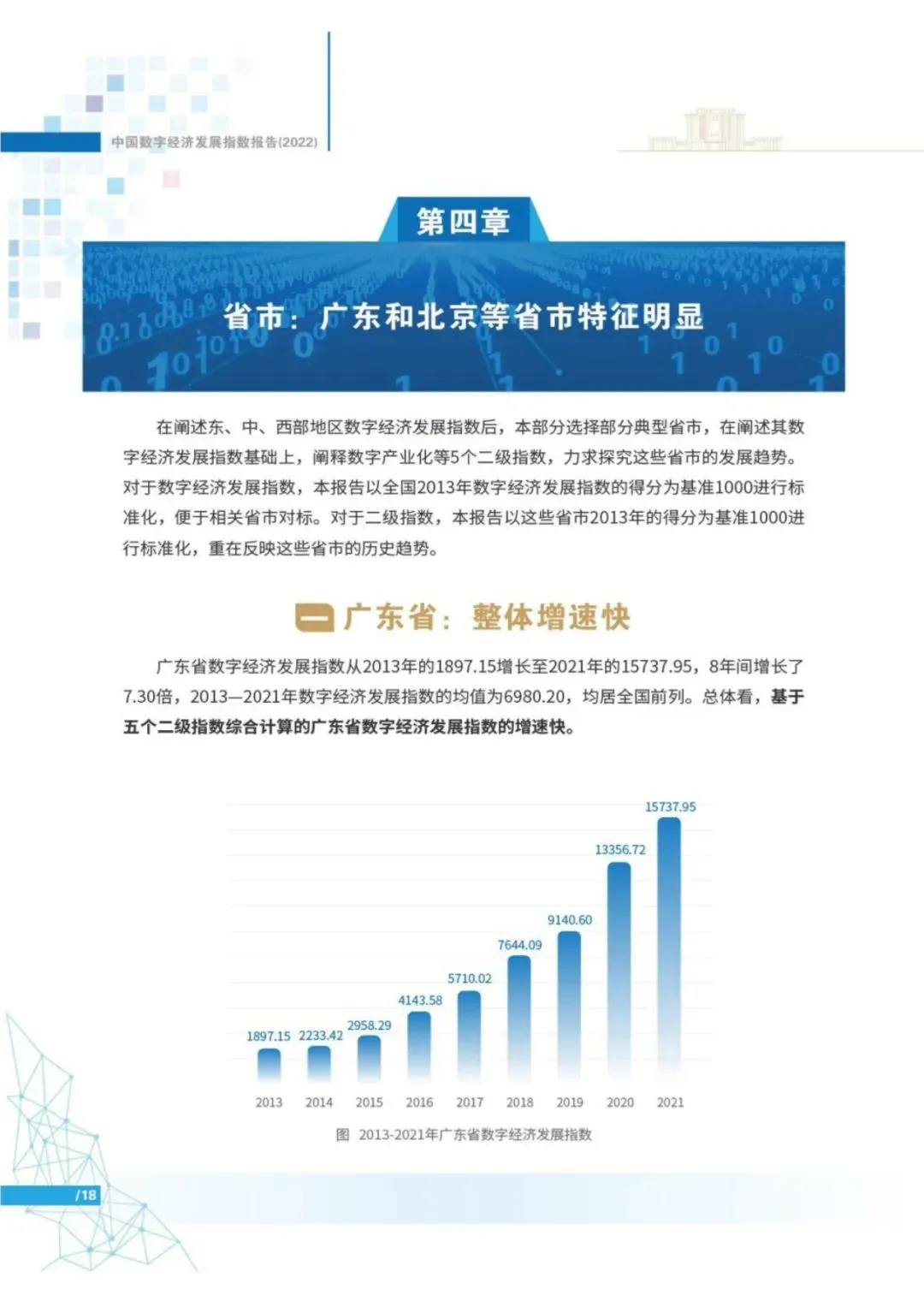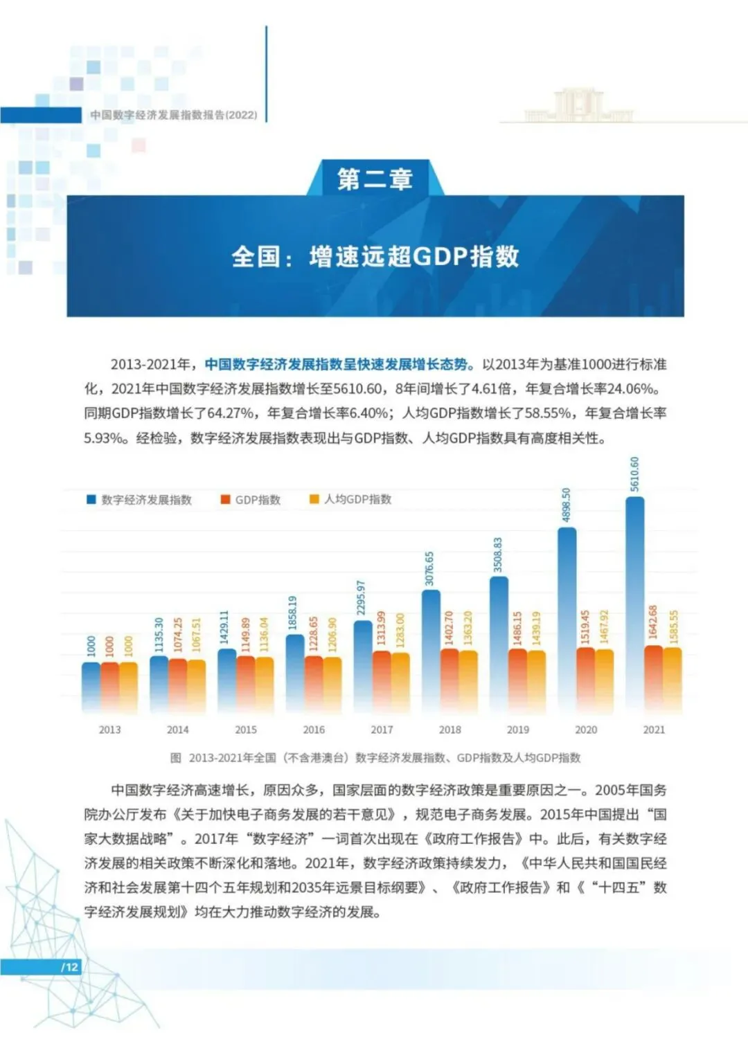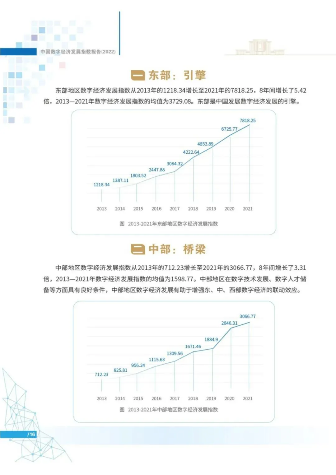 报告显示,2013年以来,中国数字经济发展指数高速增长。2013-2021年,中国数字经济发展指数由1000上升至5610.60,8年间增长了4.61倍,年复合增长率24.06%,远超同期GDP指数增速。