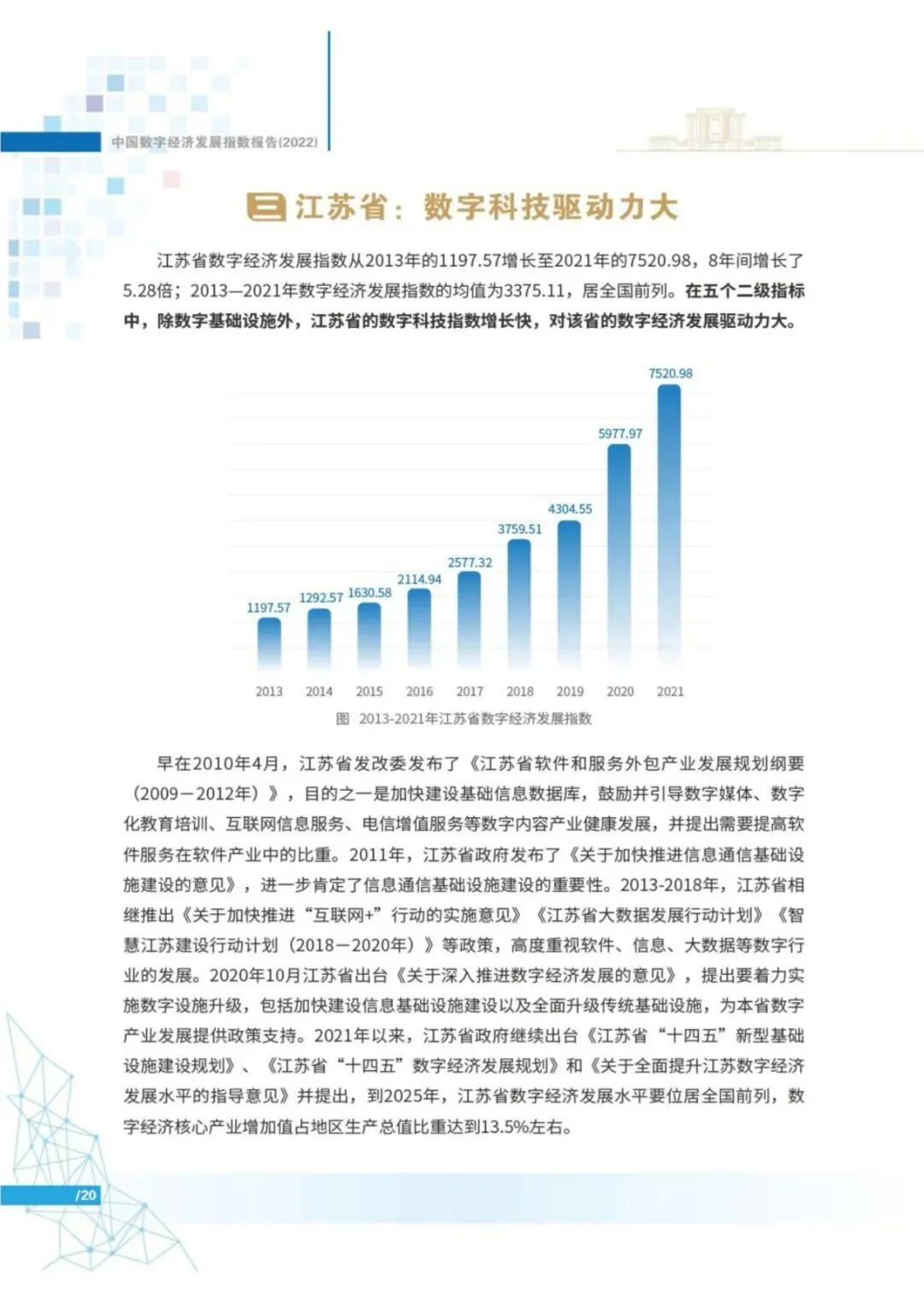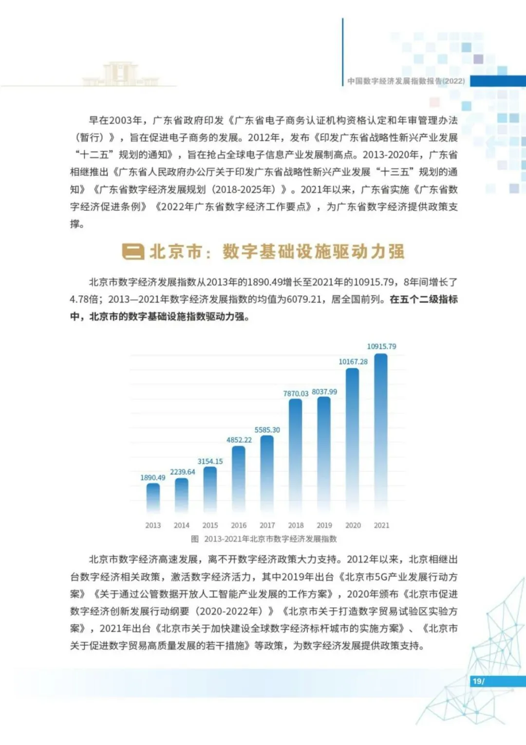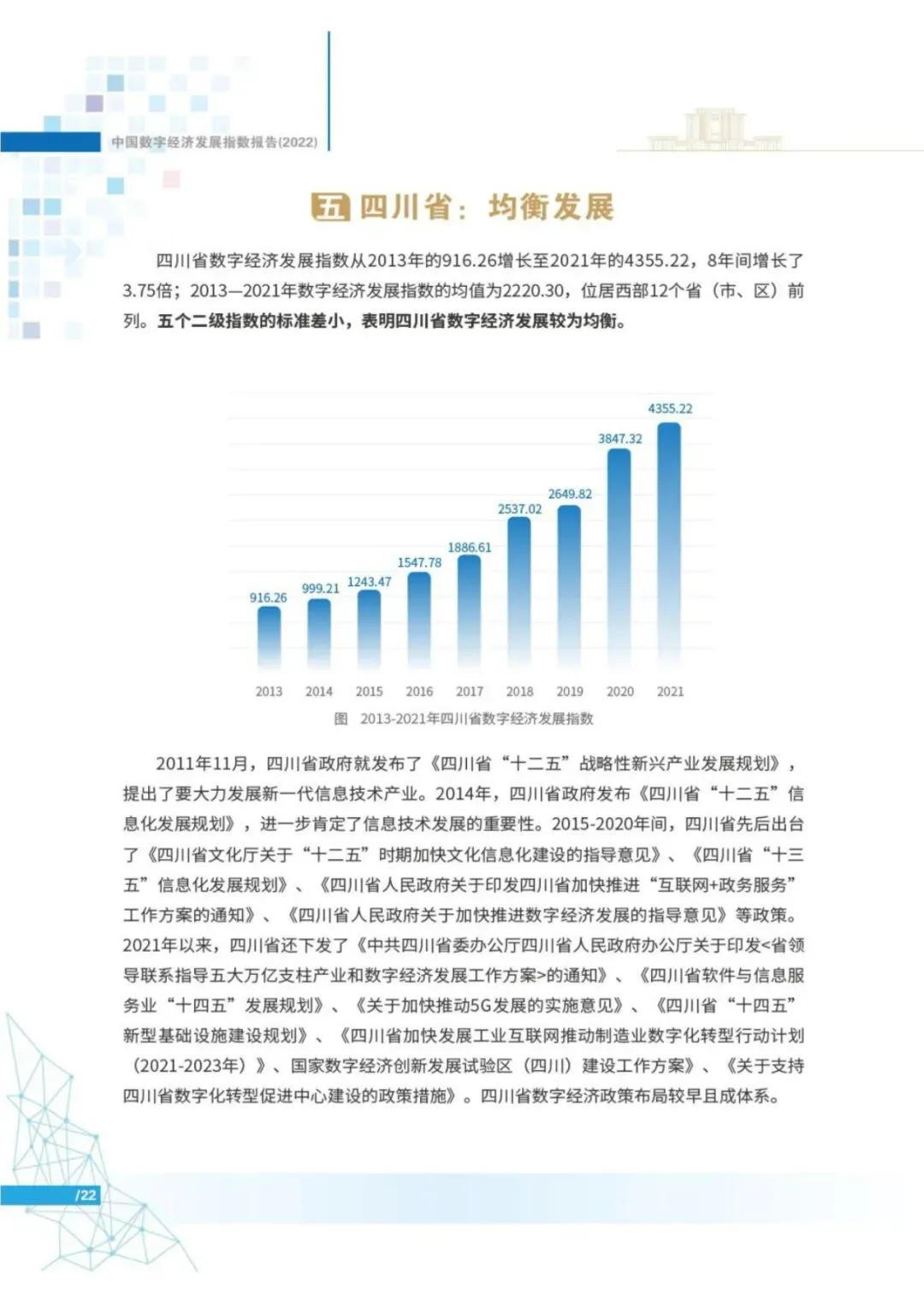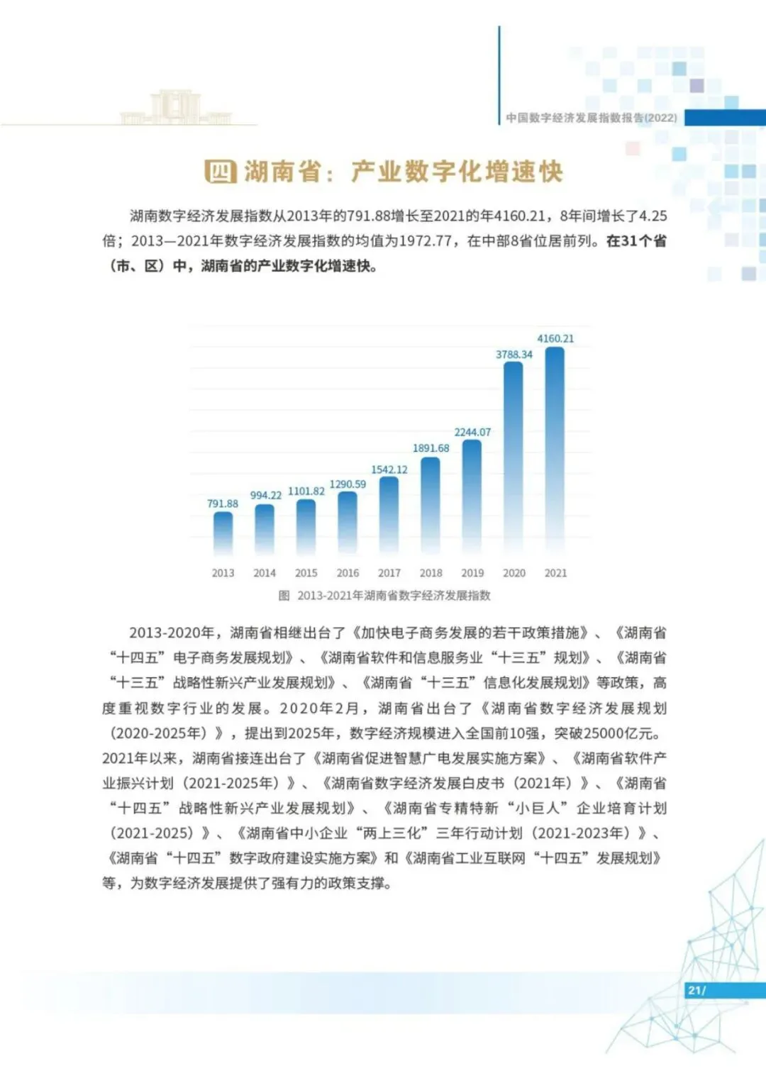 报告显示,2013年以来,中国数字经济发展指数高速增长。2013-2021年,中国数字经济发展指数由1000上升至5610.60,8年间增长了4.61倍,年复合增长率24.06%,远超同期GDP指数增速。