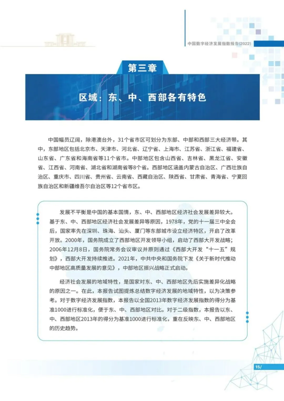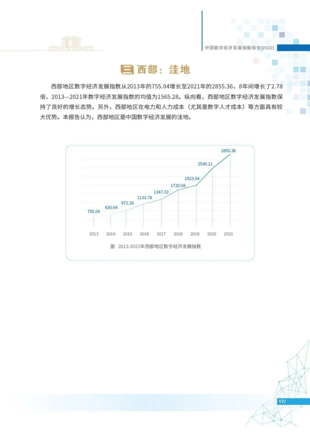 分地区看,东、中、西部地区数字经济发展指数各有特色。东部是中国数字经济发展的引擎,东部数字经济发展指数由2013年的1218.34增长至2021年的7818.25,8年间增长了5.42倍,2013—2021年数字经济发展指数的均值为3729.08。中部是中国数字经济发展的桥梁,中部数字经济发展指数从2013年的712.23增长至2021年的3066.77,8年间增长了3.31倍,2013—2021年数字经济发展指数的均值为1598.77。西部是中国数字经济发展的洼地,西部地区在电力和人力成本等方面具有优势,发展数字经济的潜力大。数字经济发展指数从2013年的755.04增长至2021年的2855.36,8年间增长了2.78倍,2013—2021年数字经济发展指数的均值为1565.28,数字经济发展后劲较足。