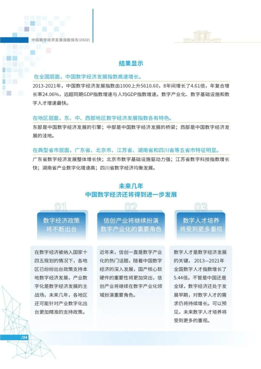 报告认为,提出未来几年,中国数字经济还将得到进一步发展。第一,数字经济政策将不断出台。第二,信创产业将继续扮演数字产业化的重要角色。第三,数字人才培养将受到更多重视。