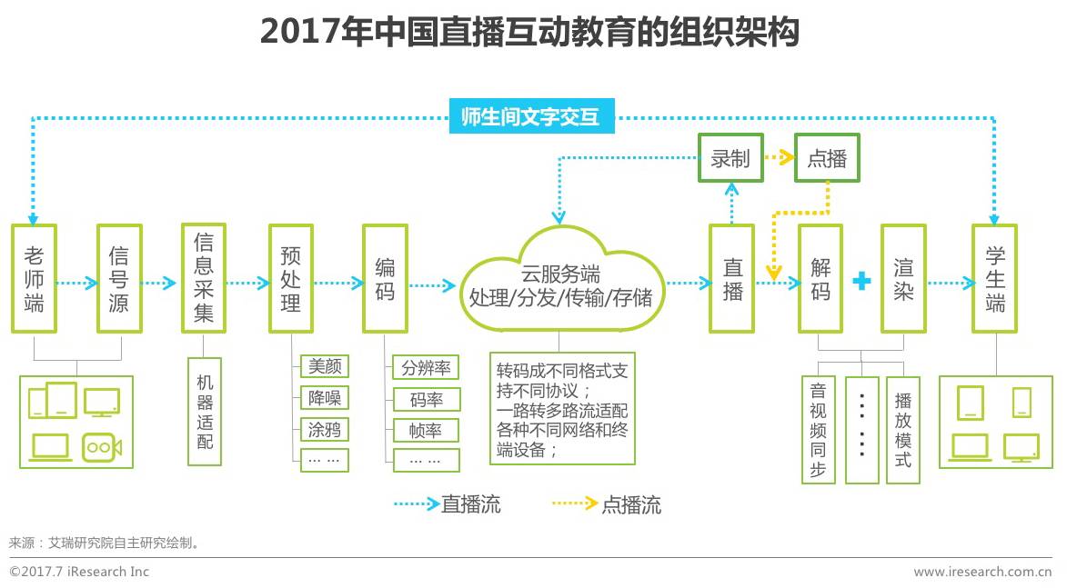 一个完整的直播系统由信息采集、预处理、编码、传输、解码、渲染几个环节组成。老师端通过硬件设备提供信号源,硬件设备和云服务端共同完成信息的预处理和编码工作,信息在云服务端完成转码等处理工作,以适应不同格式,支持不同的协议,然后经过内容分发网络分发到学生端,并在学生端设备完成信息的解码和渲染工作,适应不同播放模式的同时,实现音视频同步等效果。在学习过程中师生间的互动主要是以文字交互的方式进行。通过视频直播过程中,云端伴随相应的录制功能,并将录好的视频保存在云端,供学生进行点播,随时随地学习。