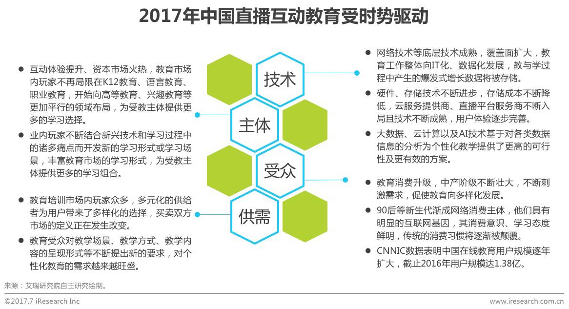 1、直播互动教育发展主要驱动力:其一,优质资源分配不均,三四线城市需求亟待释放;其二,底层技术成熟、创业市场融合创兴、消费主体变更等共同推动直播互动教育发展;其三,直播互动教育有利于流量变现。