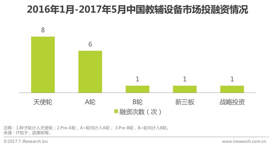 在线教育的技术服务商包含教育信息化、软件、测试、直播平台等多种服务。虽然不直接输出教学内容,但他们是实现在线教育的基础,甚至直接决定了教学体验。主要的商业模式是B2B,盈利模式比较清晰,直接向B端收费。近两年随着VR等新兴技术的兴起,不断涌现出一批教辅设备的创业者。截至2017年6月1日,资本市场对教辅设备共进行了17次投资,虽然目前以天使轮和A轮融资居多,但从投资次数来看,资本市场对新兴技术应用到在线教育表现出了浓厚的兴趣。