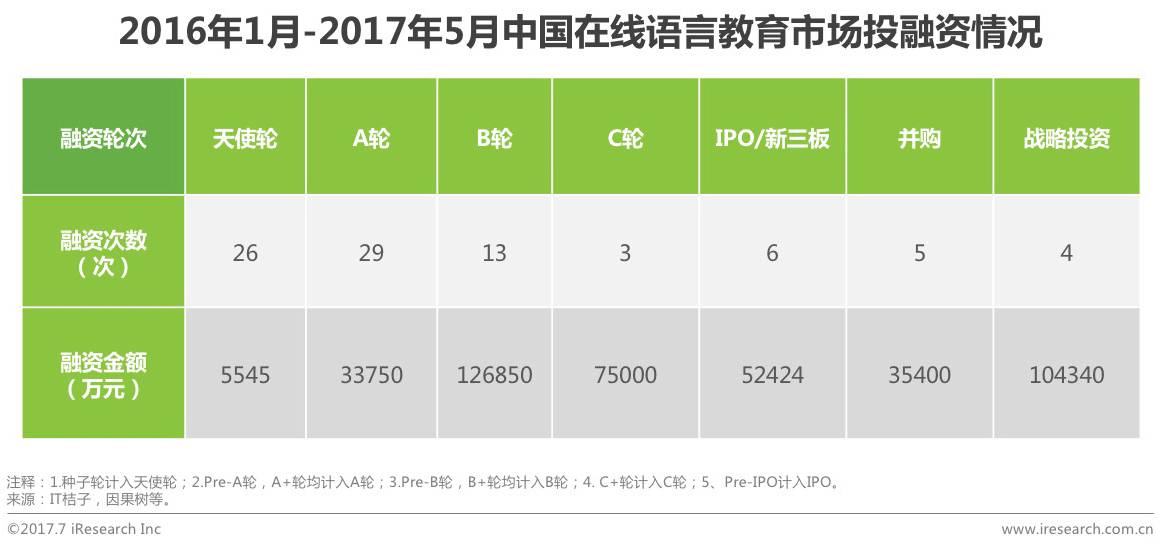 据艾瑞统计数据显示,投资方面,从2016年1月1日至2017年6月1日,在线语言市场共计86次融资,其中天使轮和A轮融资次数占55起,新的创业者不断涌入市场。但从融资金额来看,资本市场趋于理性,天使轮和A轮的融资金额不足4亿元。其原因可能主要是以下两个方面:其一,语言类直播互动教育市场趋于同质化,资本尚未发现更新颖的项目,故在投资金额方面更慎重;其二,目前市场尚未出现巨头企业,市场还有很多机会可供挖掘,资本方不愿意错过任何一个可能机会。