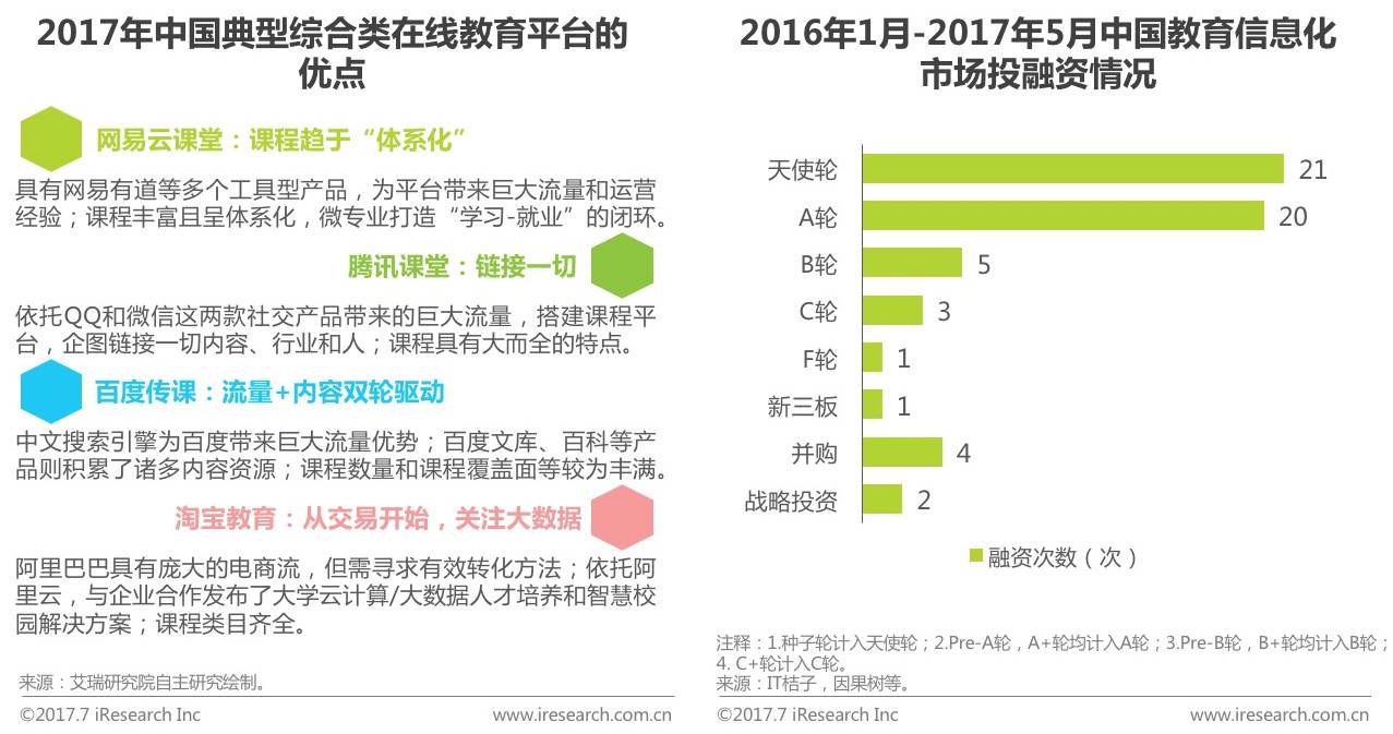 截至2017年6月1日,在线教育信息化市场表现出极大的活跃度,资本市场发生57次投融资,随着底层技术的不断成熟,越来越多的创业者企图从技术和平台服务切入来分一杯羹。未来教育平台不仅是一个将老师和学生链接起来的平台,而是能根据用户需求推荐精准匹配的课程,为他们提供良好的学习及分析工具,集优质内容与全面服务于一体。