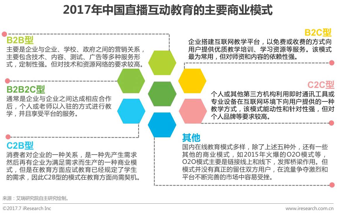 在线教育经过多年的发展积累,其市场规模不断扩大,商业模式也经过众多创业者的不断摸索与创新而不断丰富。目前中国主流的商业模式主要包括B2B型、B2C型、B2B2C型和C2C型,他们各具特点。其中B2B型和B2C型是市面上最常见的商业模式。B2B型主要是向企业或学校提供技术或教学资源,其客户稳定性相对较高,盈利空间也相对较大。B2C型则对优质师资和教学内容的要求更高,名师和优质内容能够吸引更多的流量,马太效应容易在B2C型体现。 B2B2C型和C2C型相对于老师而言的自主性相对较高。C2B型则是未来的一种发展趋势。